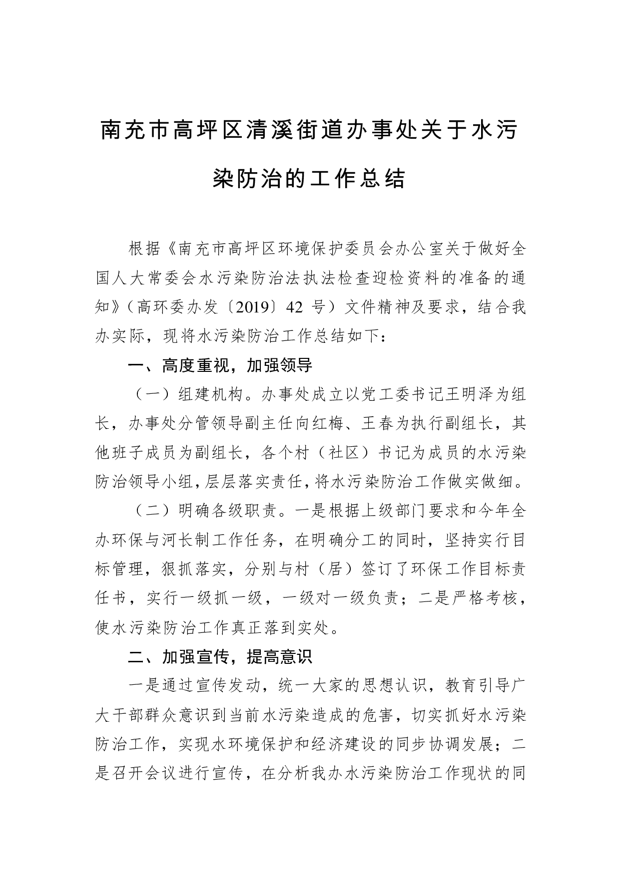 标题:南充市高坪区清溪街道办事处关于水污染防治的工作总结