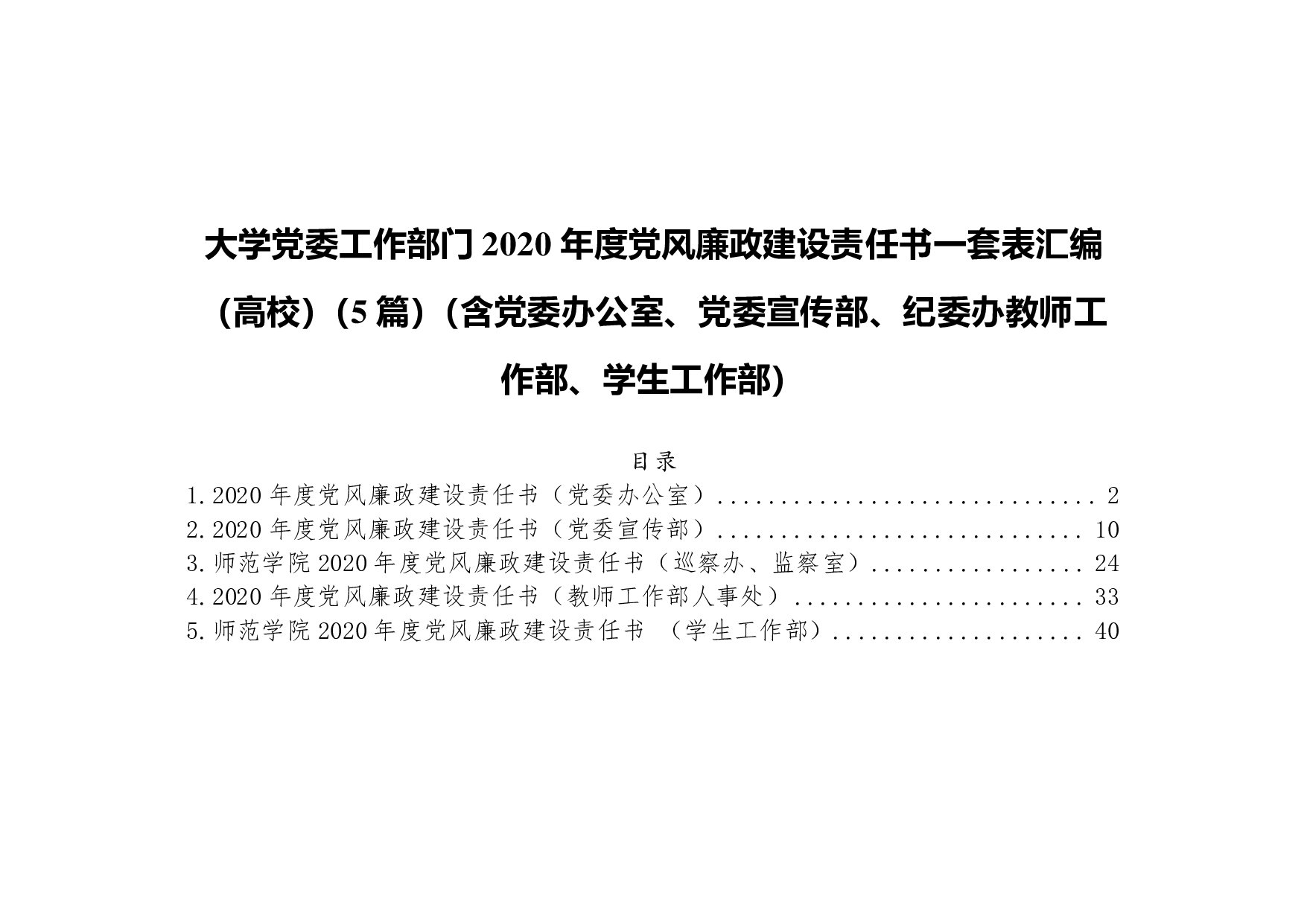 标题:大学党委工作部门2020年度党风廉政建设责任书一套表汇编(高校)(5篇)(含党委办公室、党委宣传部、纪委办教师工作部、学生工作部)