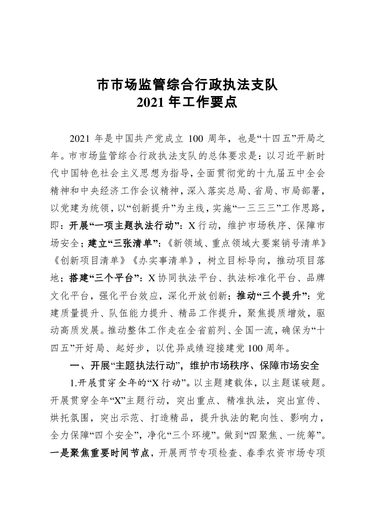 标题:2021年市场监管综合行政执法支队工作要点