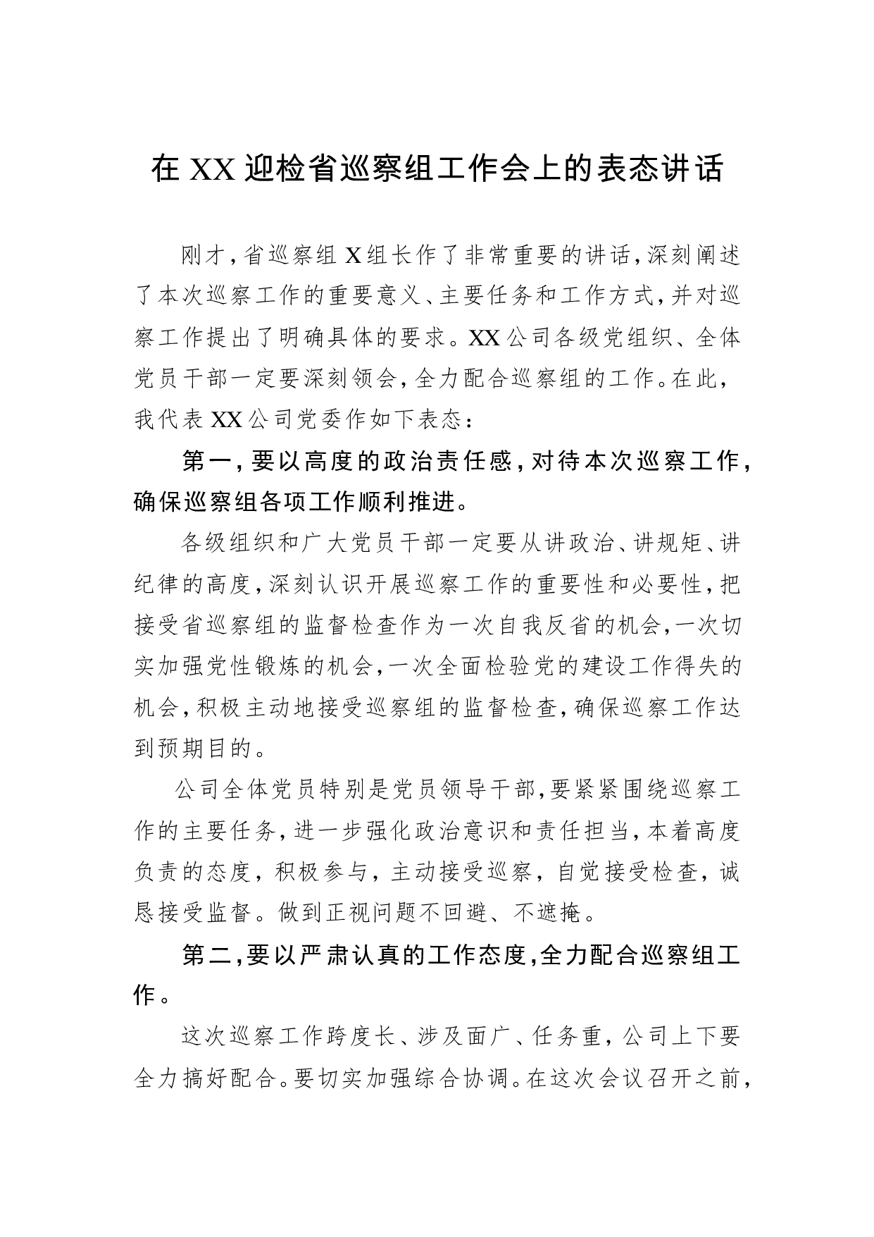 标题:党委书记在XX迎检省巡察组工作会上的表态讲话