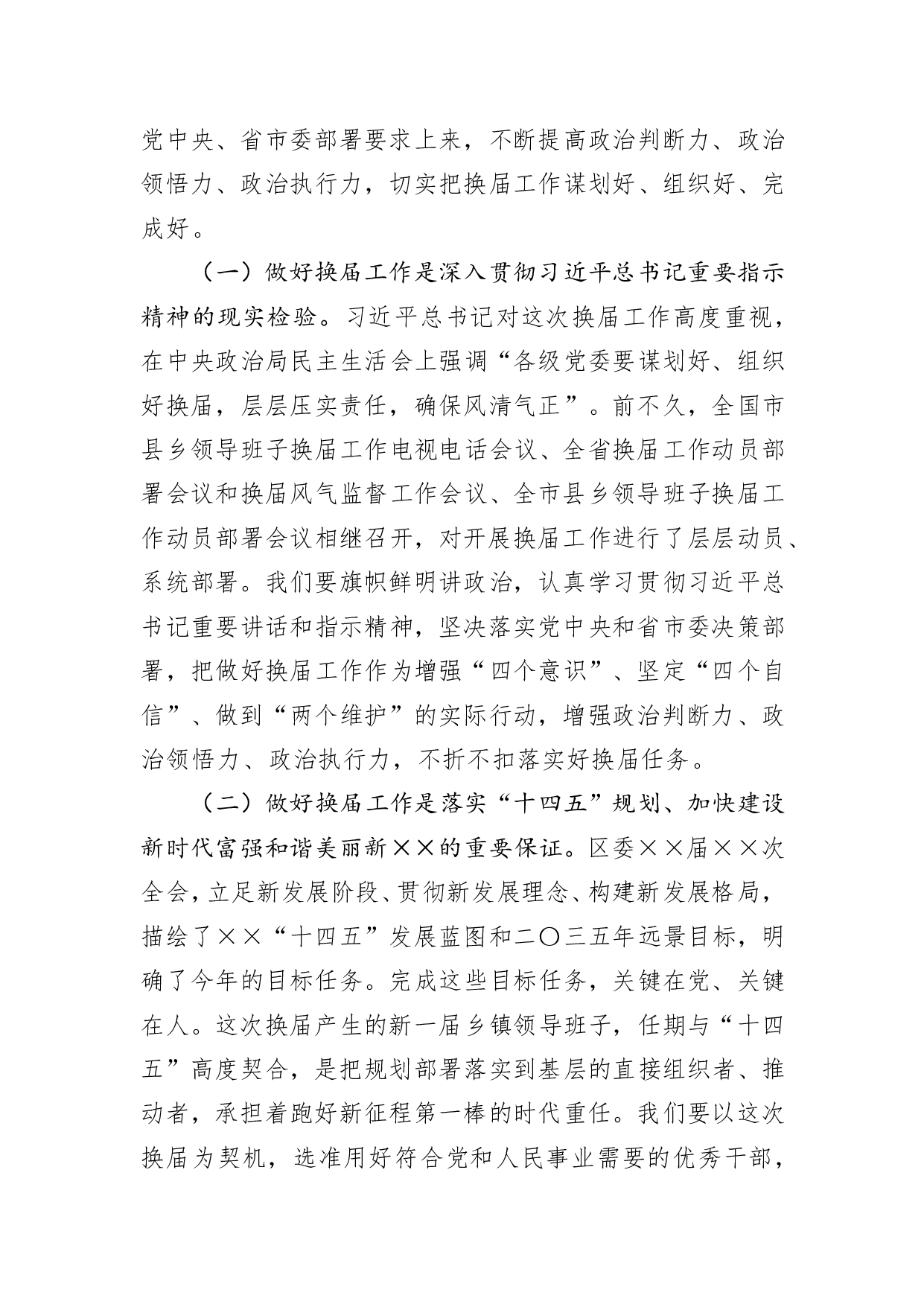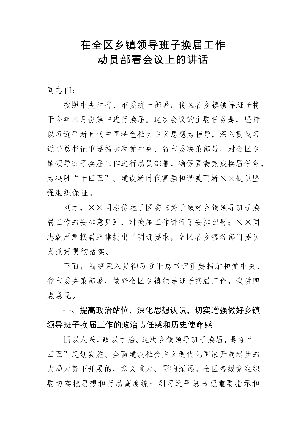 标题:在全区乡镇领导班子换届工作动员部署会议上的讲话