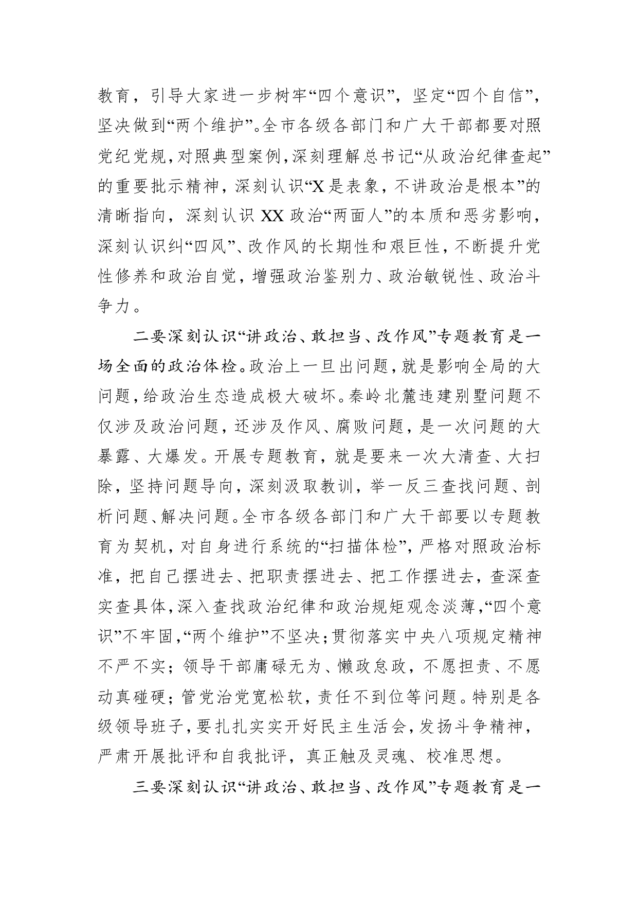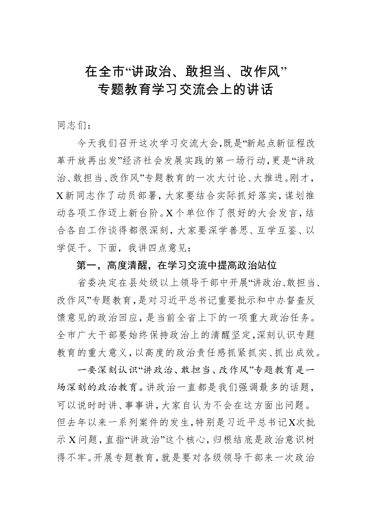 标题:在全市讲政治敢担当改作风专题教育学习交流会上的讲话