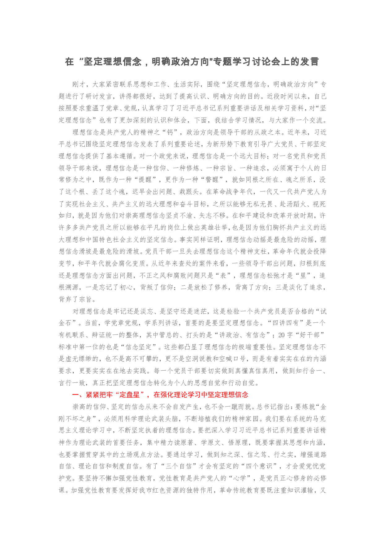 标题:在“坚定理想信念,明确政治方向”专题学习讨论会上的发言