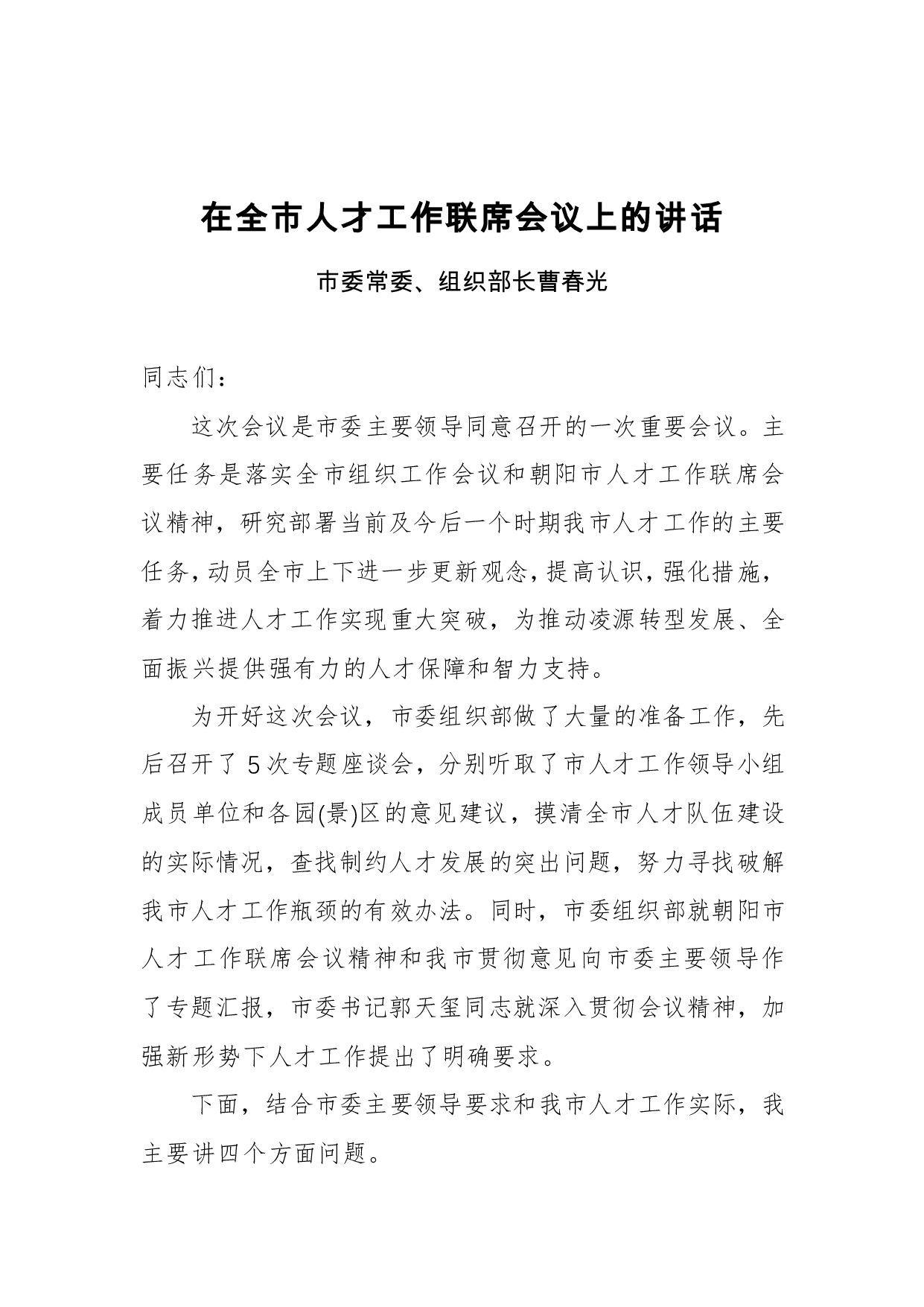 标题:市委常委、组织部长曹春光:在全市人才工作联席会议上的讲话