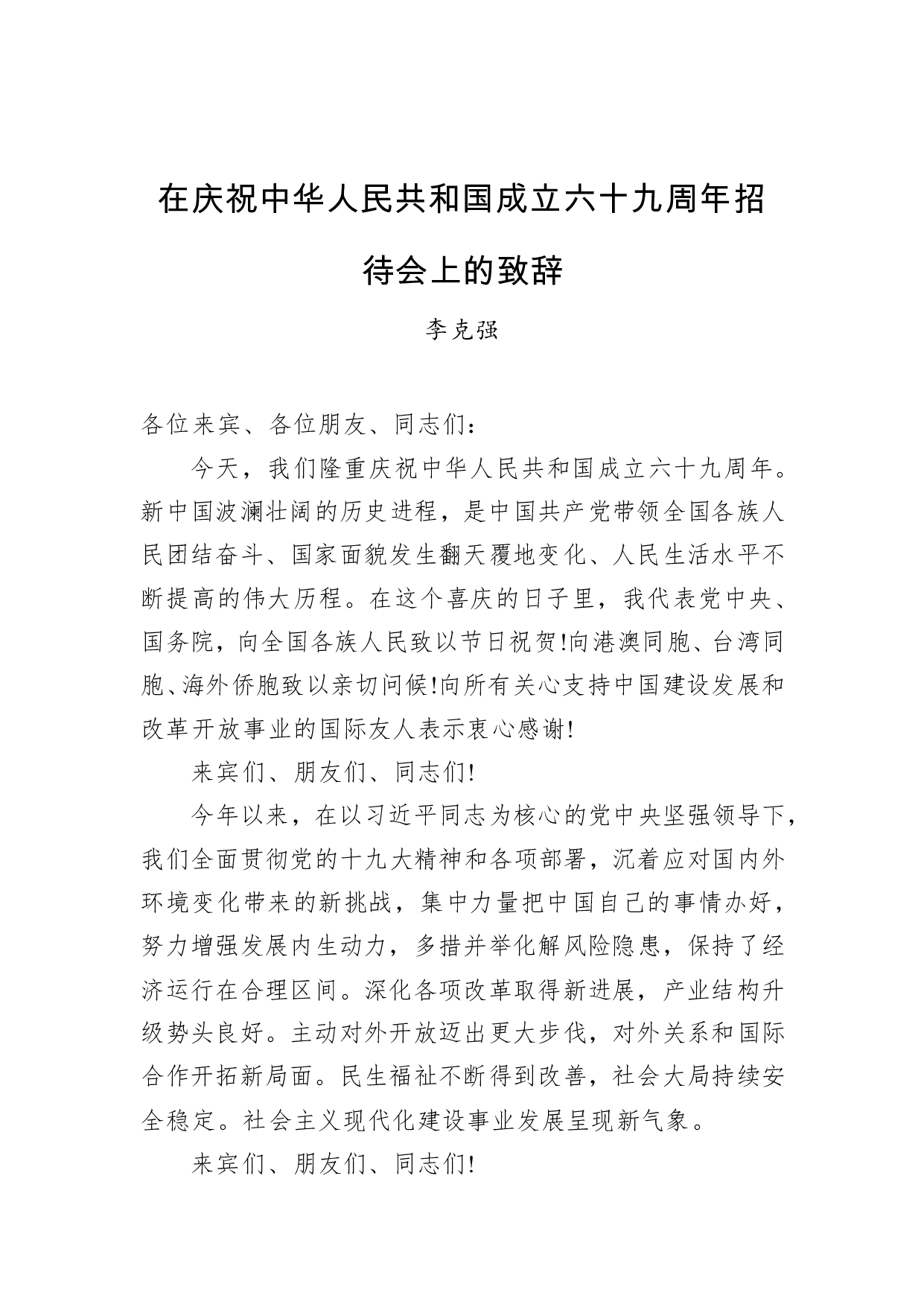 标题:李克强:在庆祝中华人民共和国成立六十九周年招待会上的致辞_转换