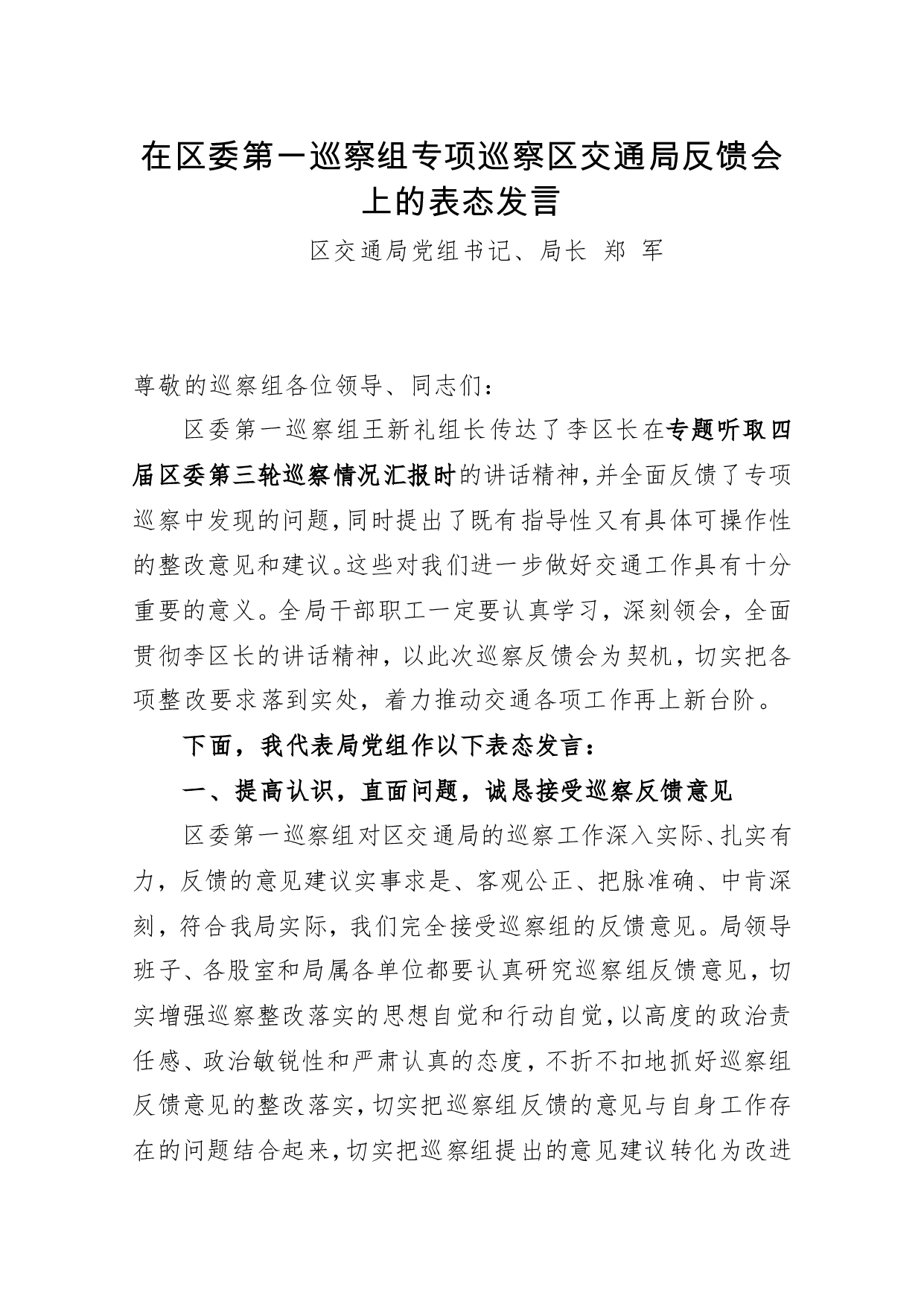 标题:在区委第一巡察组专项巡察区交通局反馈会上的表态发言