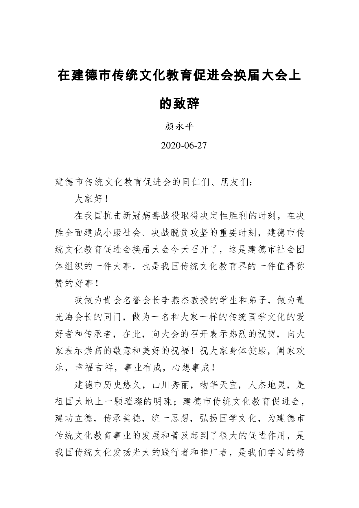 标题:颜永平:在建德市传统文化教育促进会换届大会上的致辞