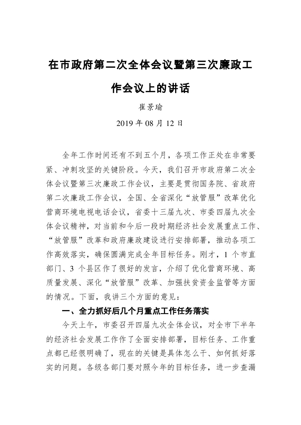 标题:崔景瑜:在市政府第二次全体会议暨第三次廉政工作会议上的讲话