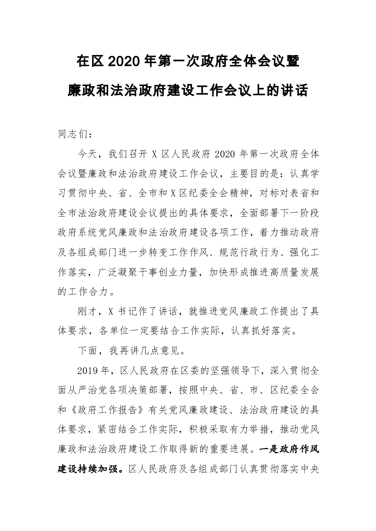 标题:在区2020年第一次政府全体会议暨廉政和法治政府建设工作会议上的讲话
