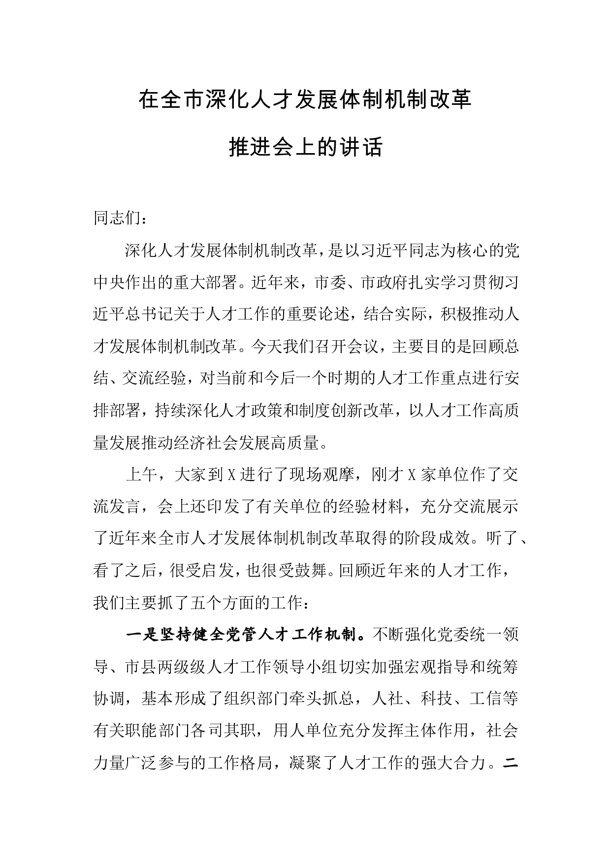 标题:在全市深化人才发展体制机制改革推进会上的讲话