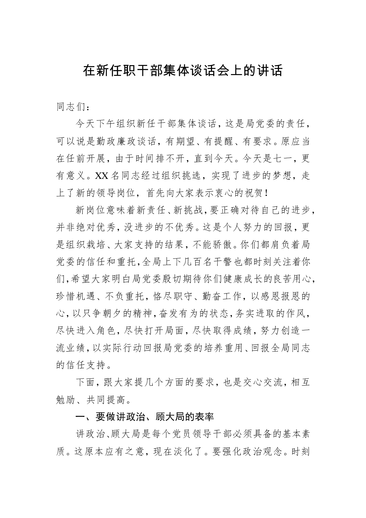 标题:在新任职干部集体谈话会上的讲话