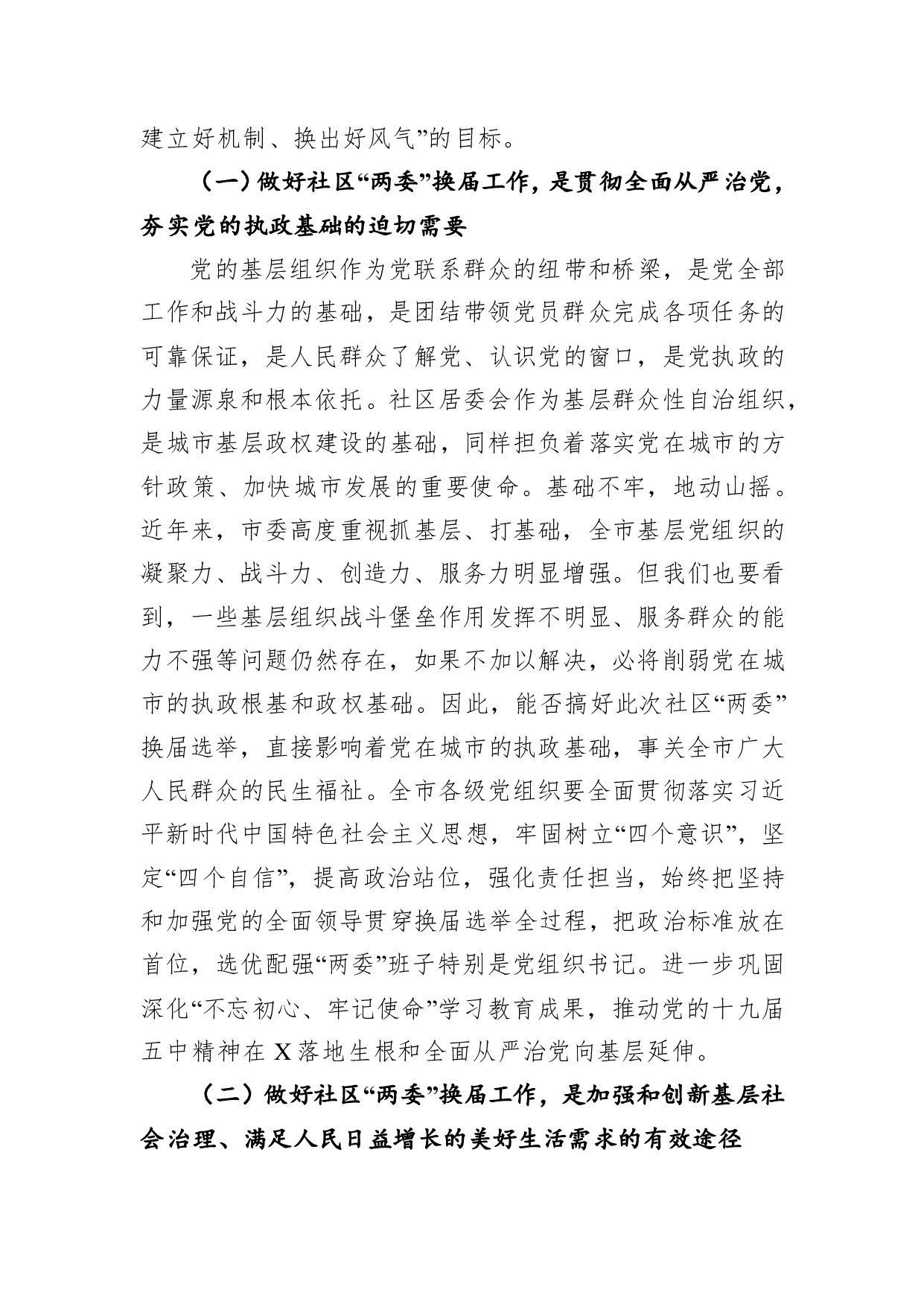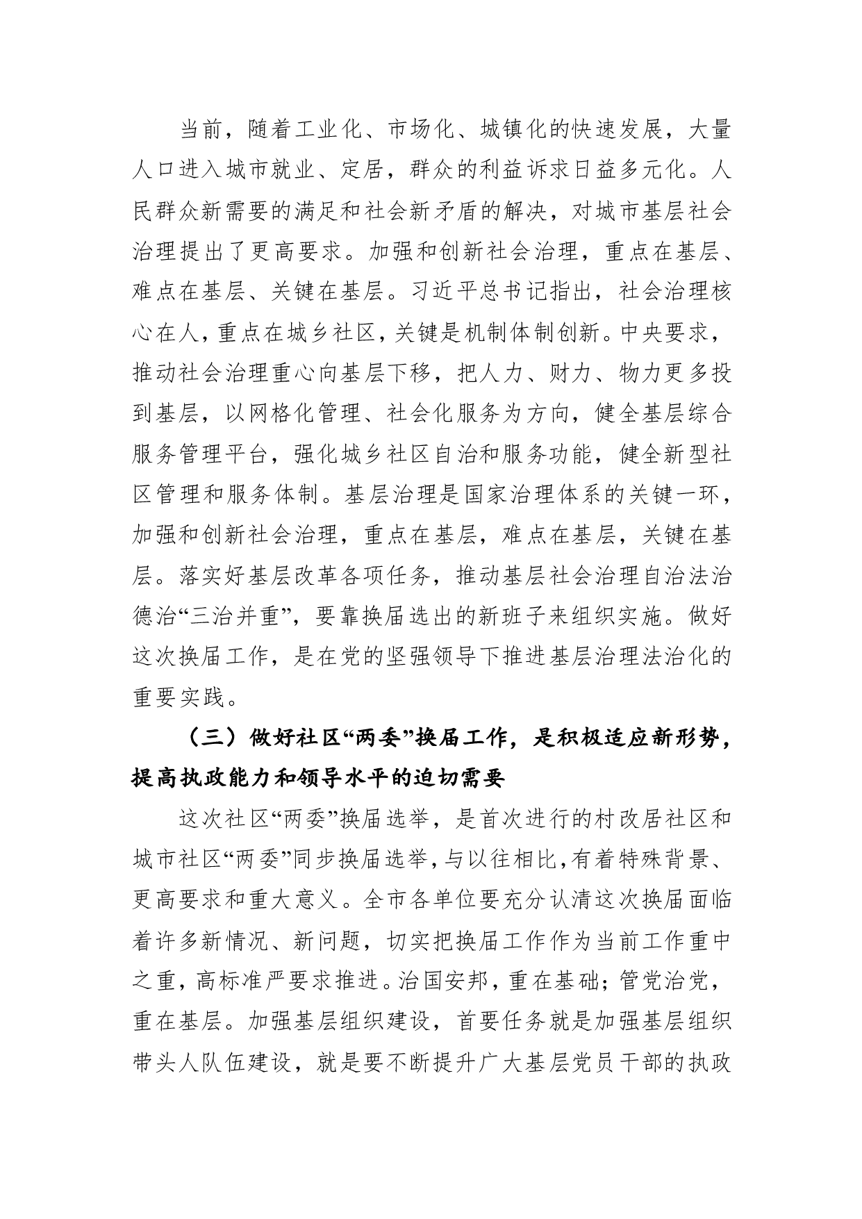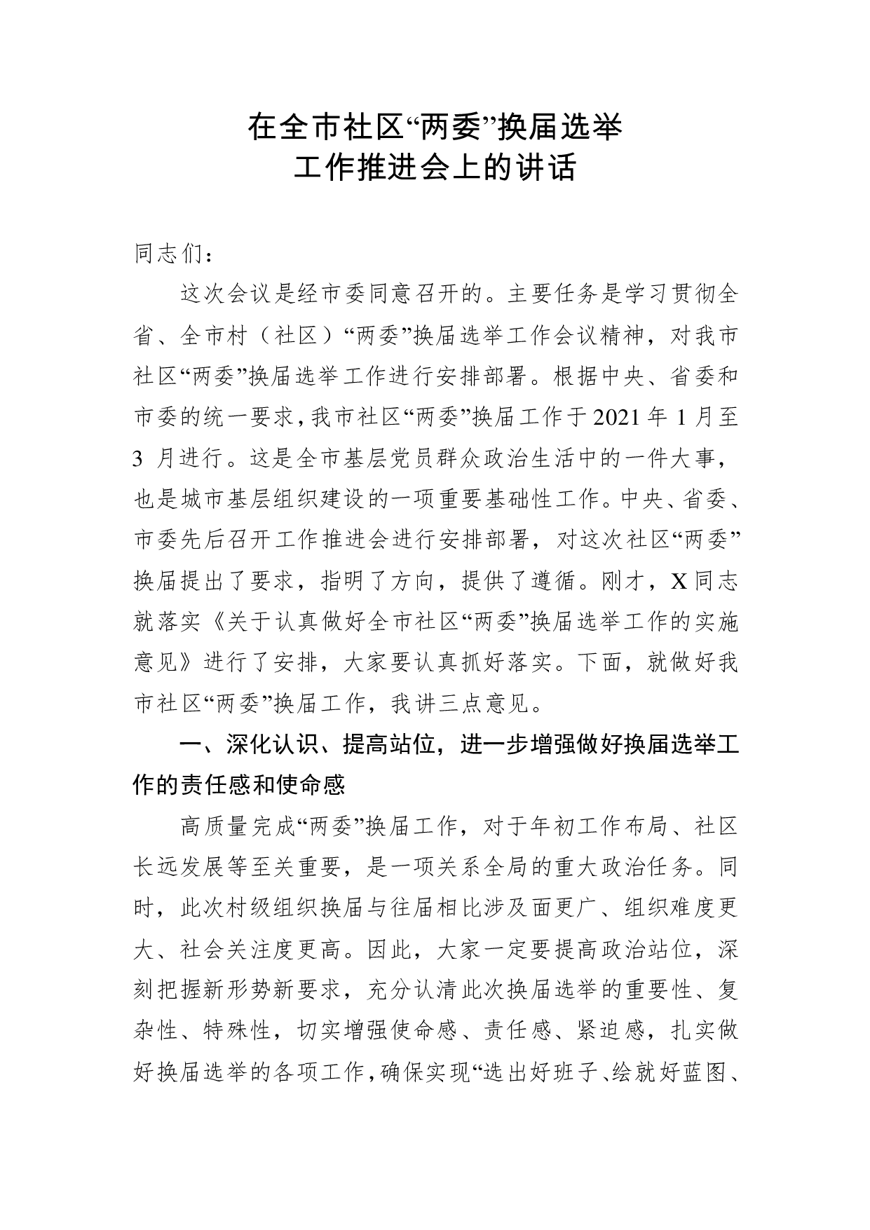 标题:在全市社区“两委”换届选举工作推进会上的讲话