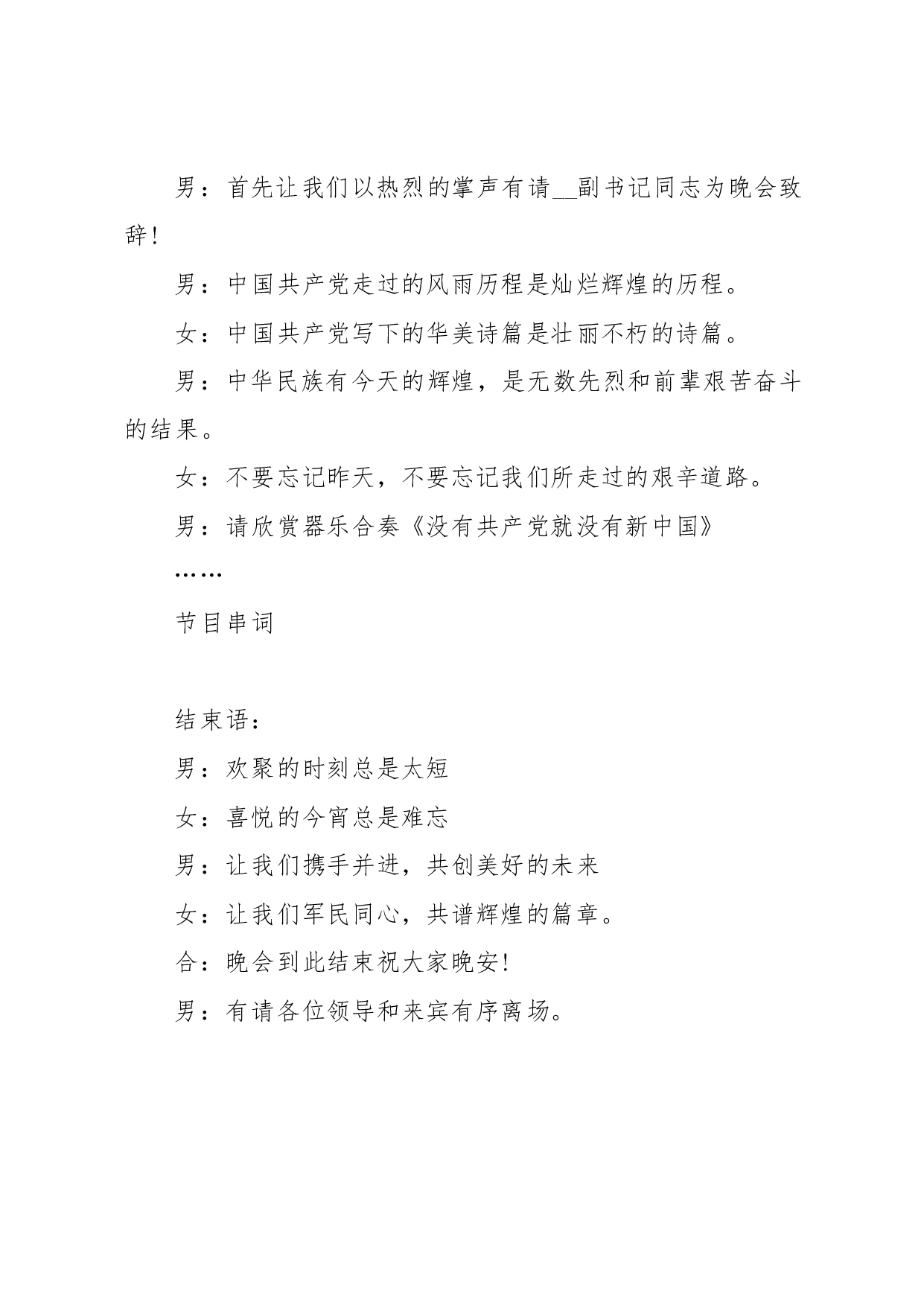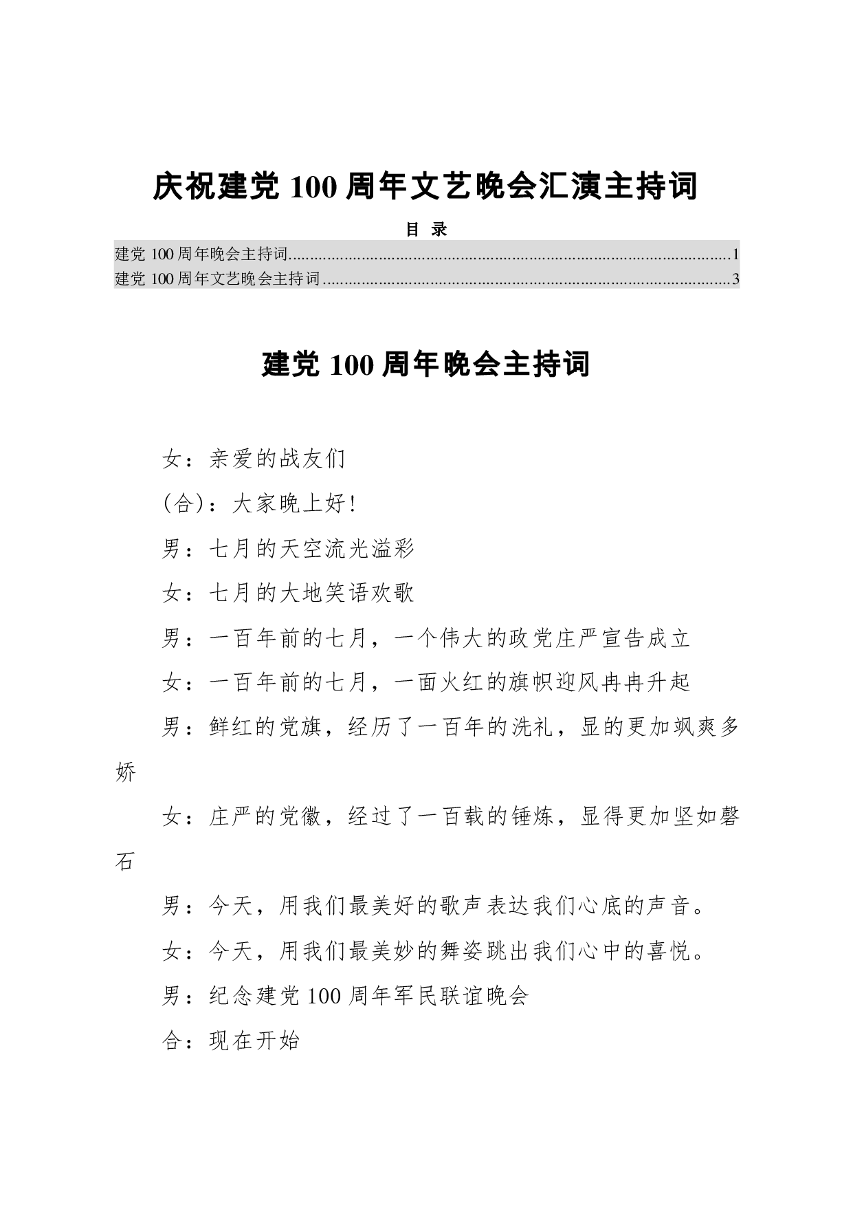 标题:庆祝建党100周年文艺晚会汇演主持词(2篇)