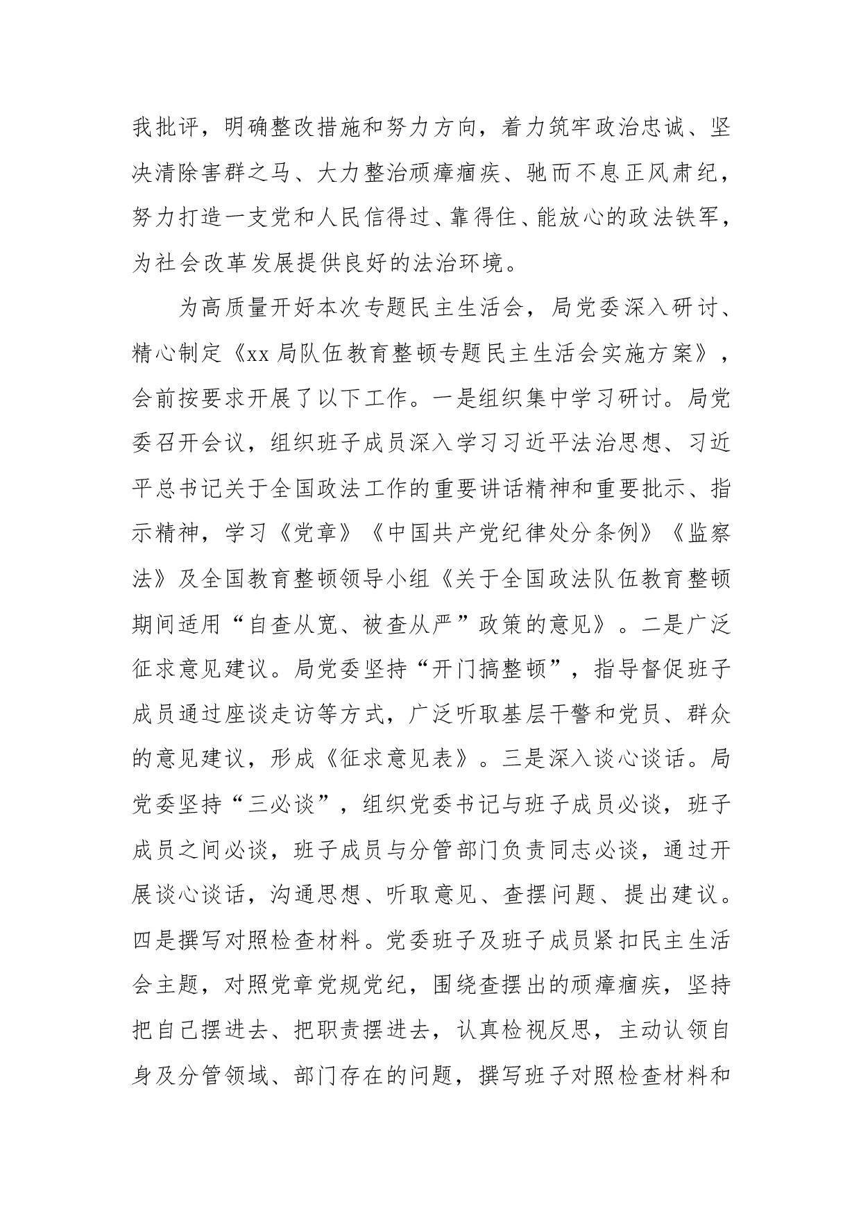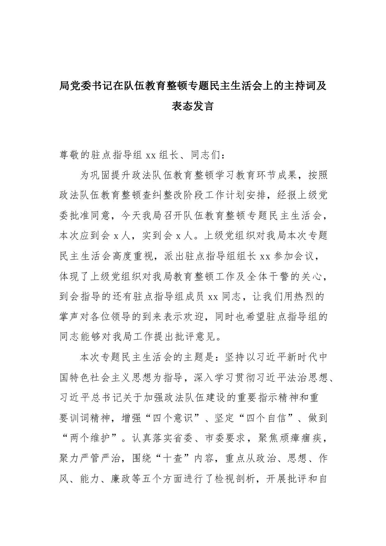 标题:局党委书记在队伍教育整顿专题民主生活会上的主持词及表态发言