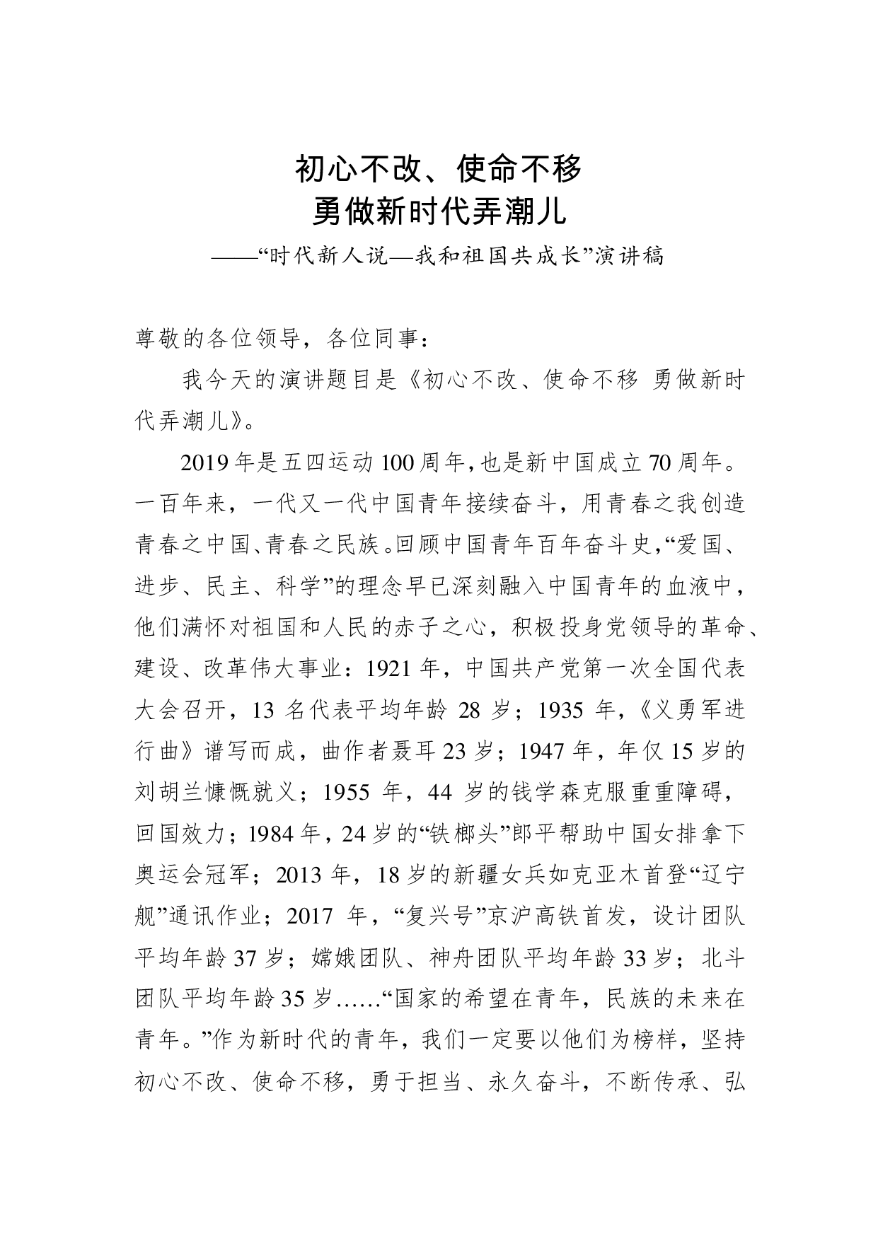 标题:不忘初心演讲:“时代新人说—我和祖国共成长”演讲稿儿时代新人说我和祖国共成长演讲稿