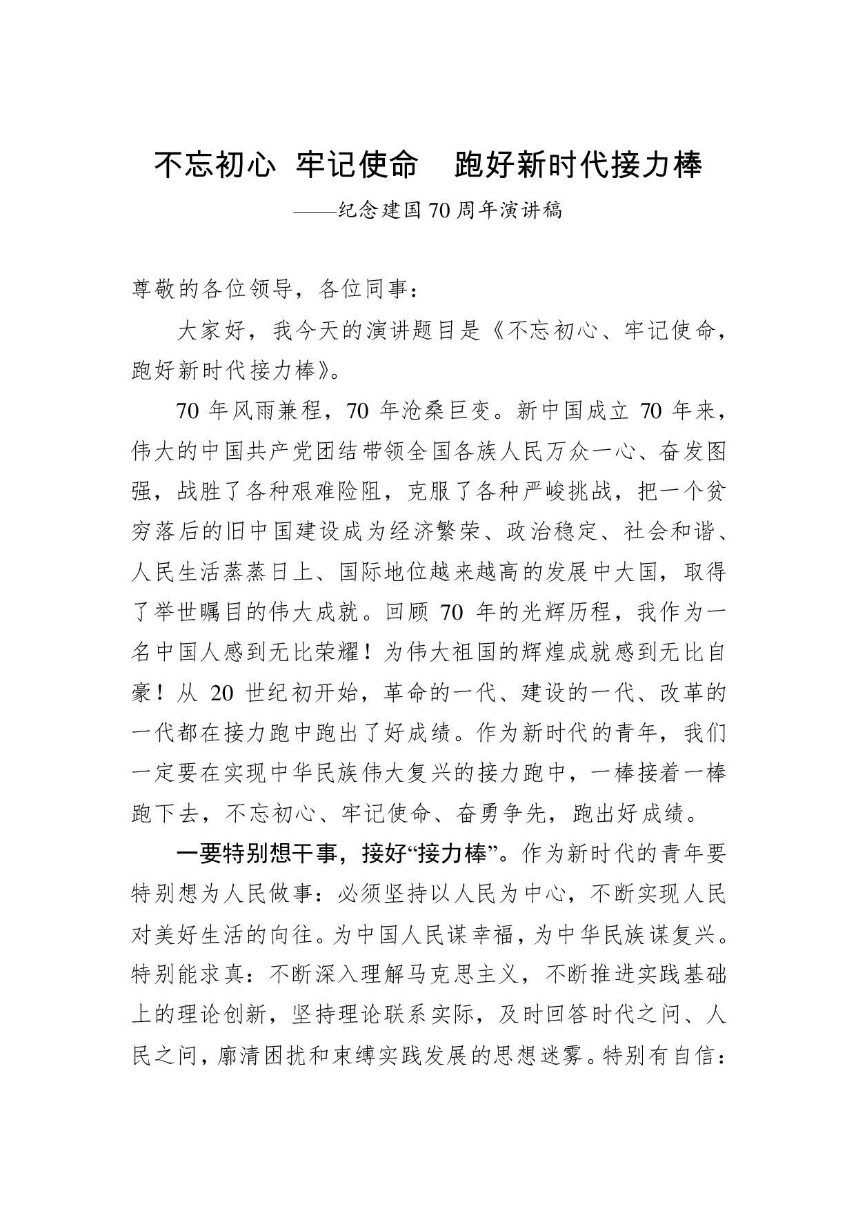 标题:不忘初心牢记使命跑好新时代接力棒纪念建国70周年演讲稿
