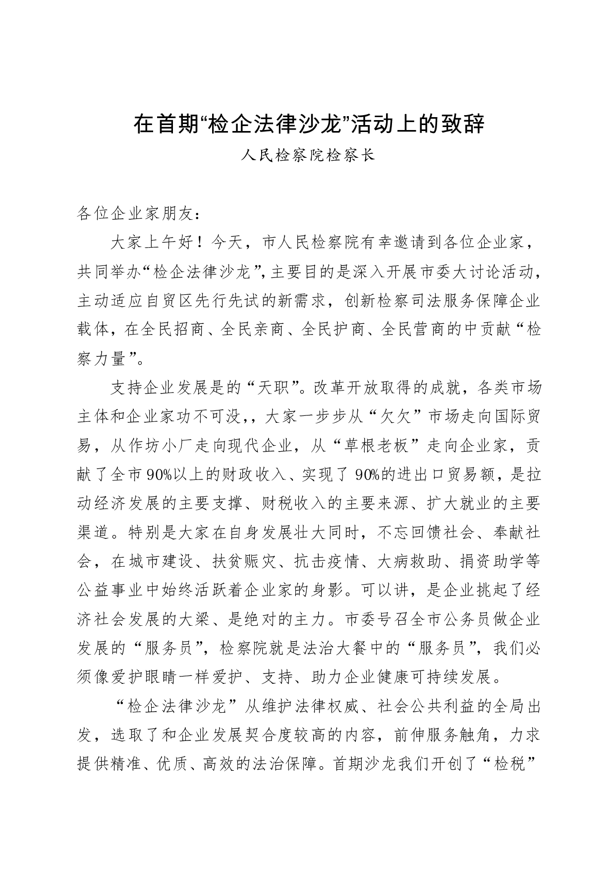 标题:检察院检察长在“检企法律沙龙”活动上的致辞