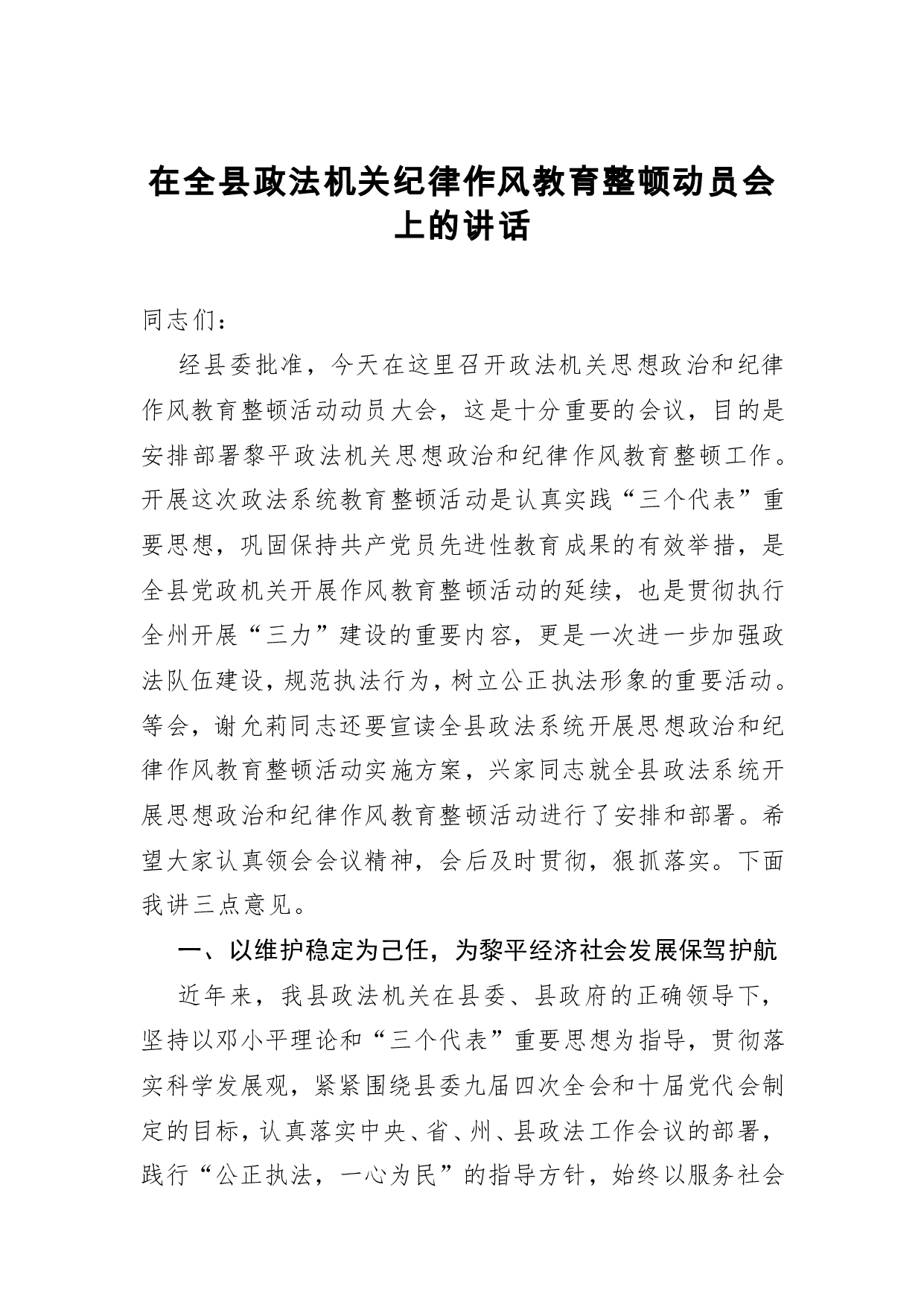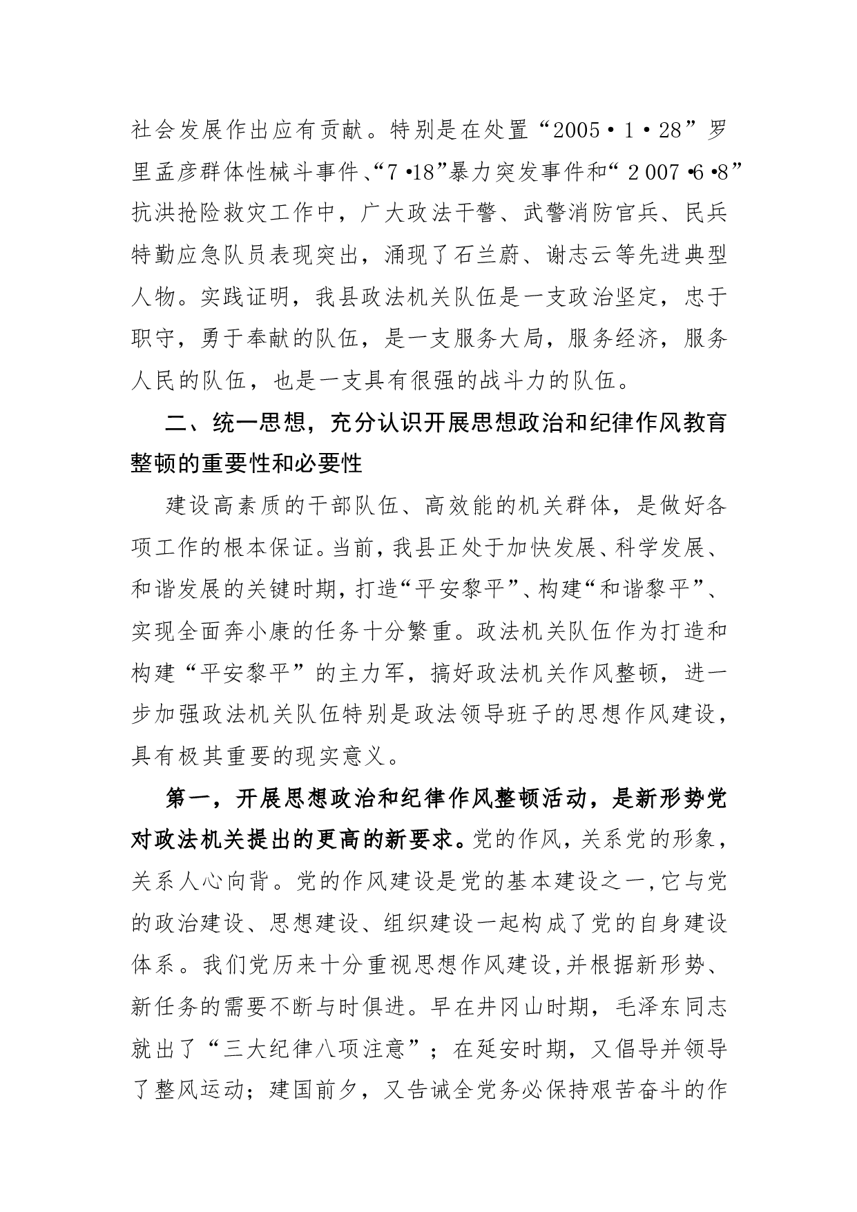 标题:县委书记在全县政法机关纪律作风教育整顿动员会上的讲话