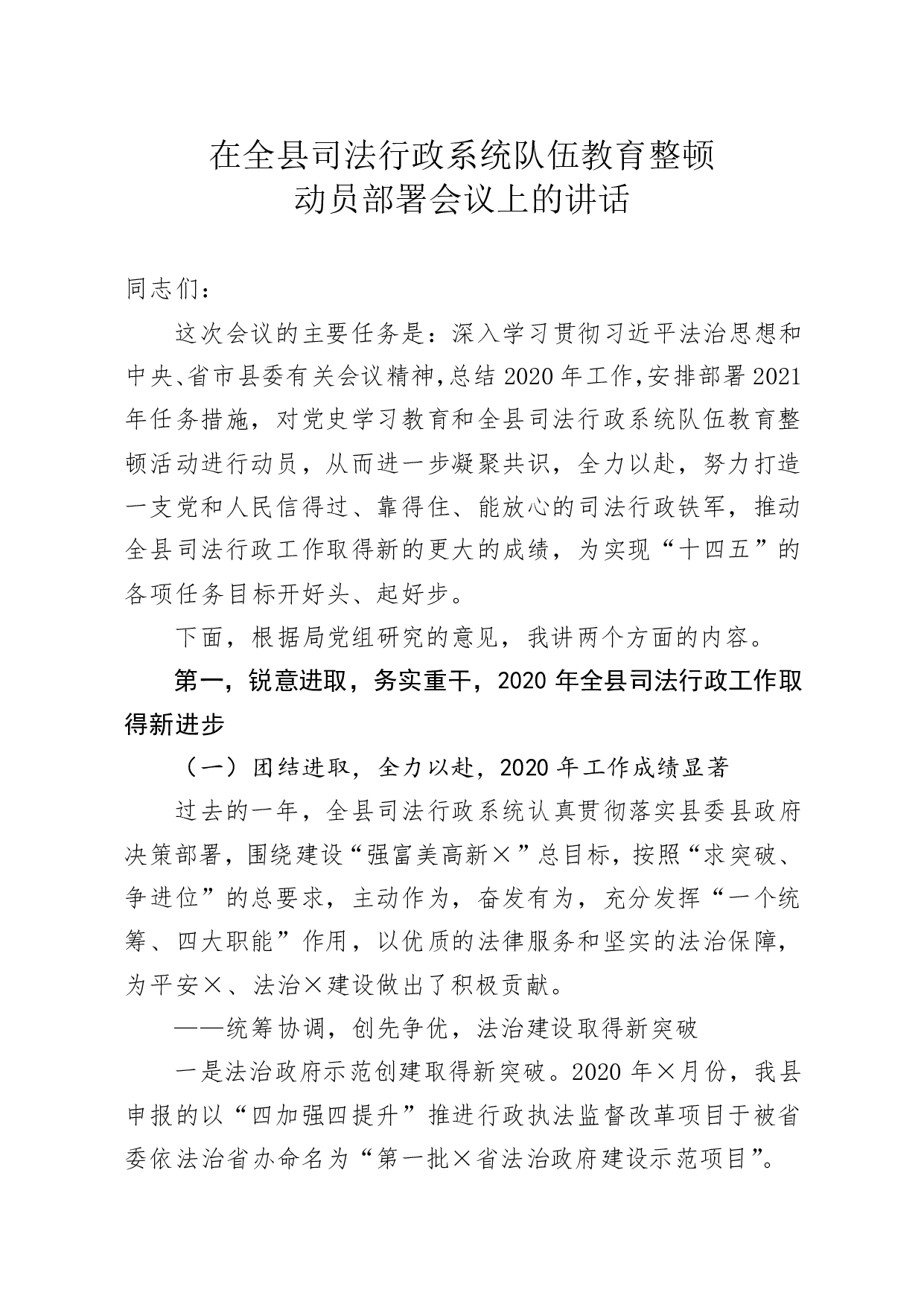 标题:在全县司法行政系统队伍教育整顿动员部署会议上的讲话
