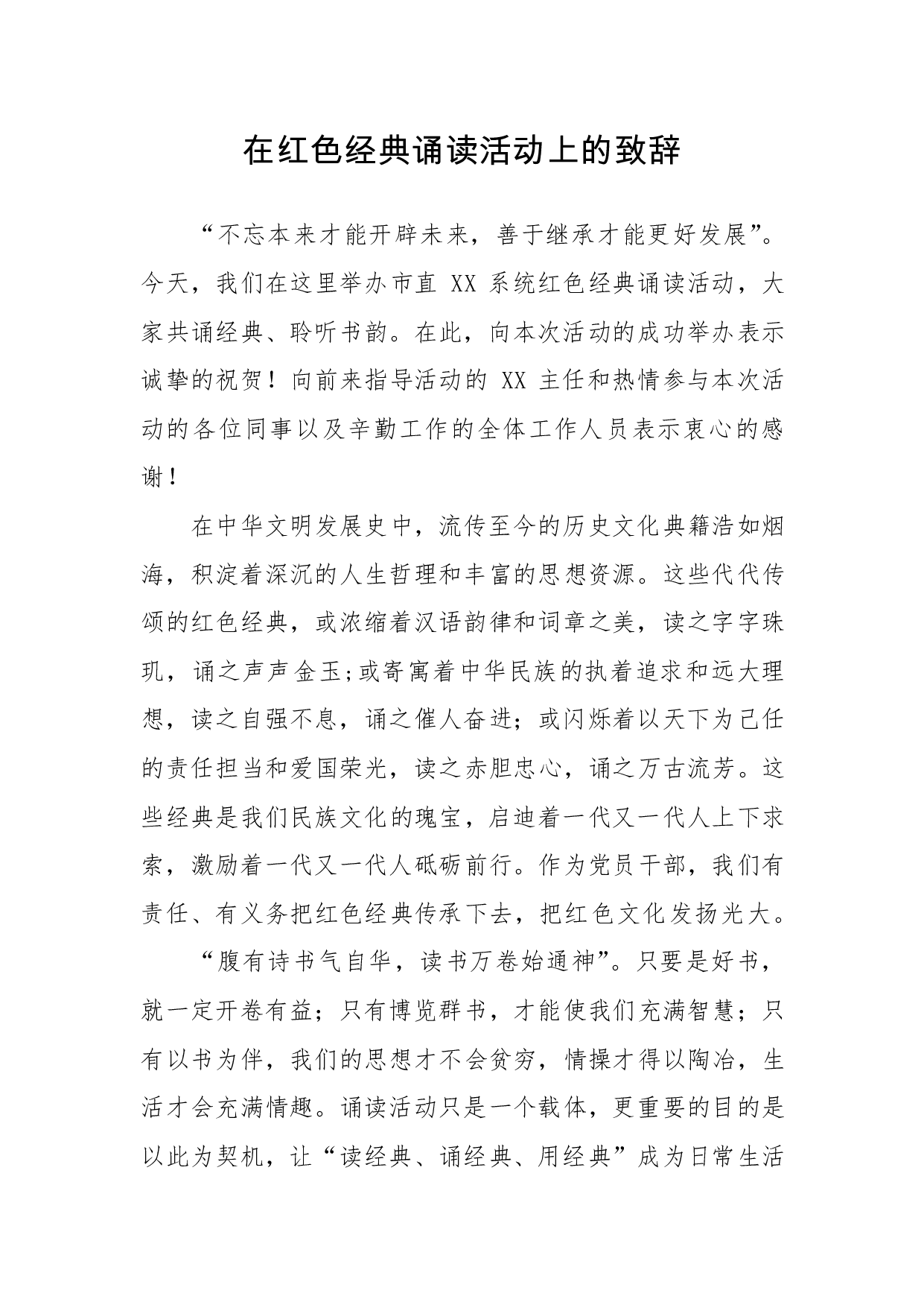 标题:在红色经典诵读活动上的致辞