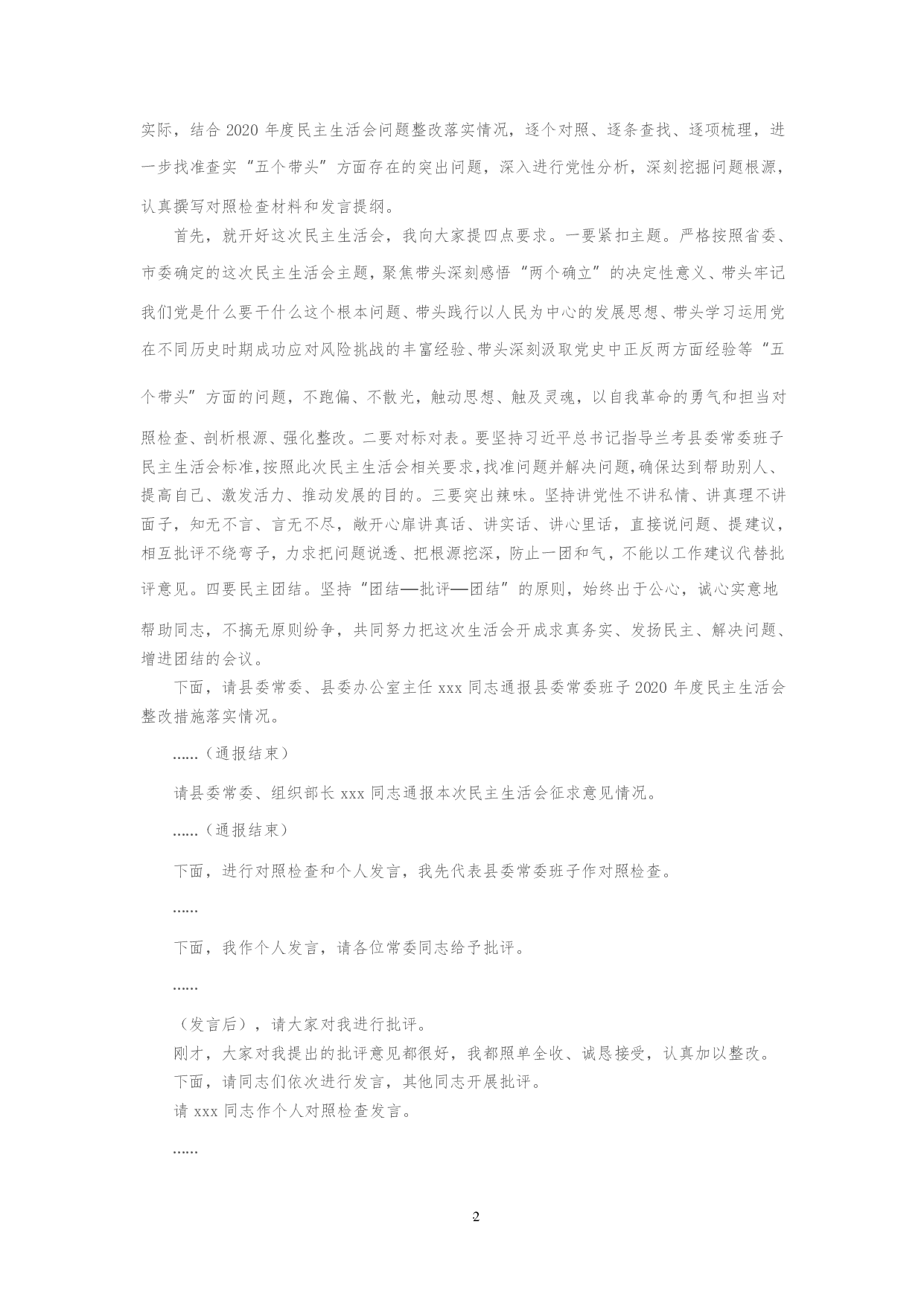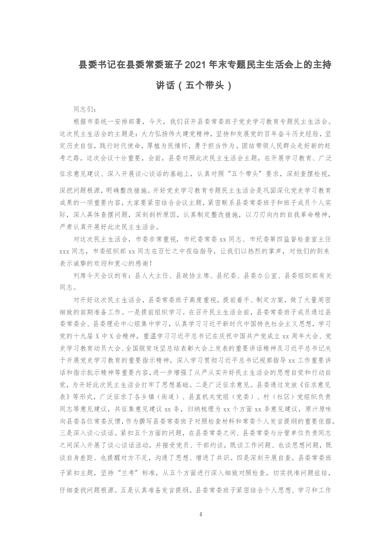 标题:县委书记在县委常委班子2021年末专题民主生活会上的主持讲话(五个带头)