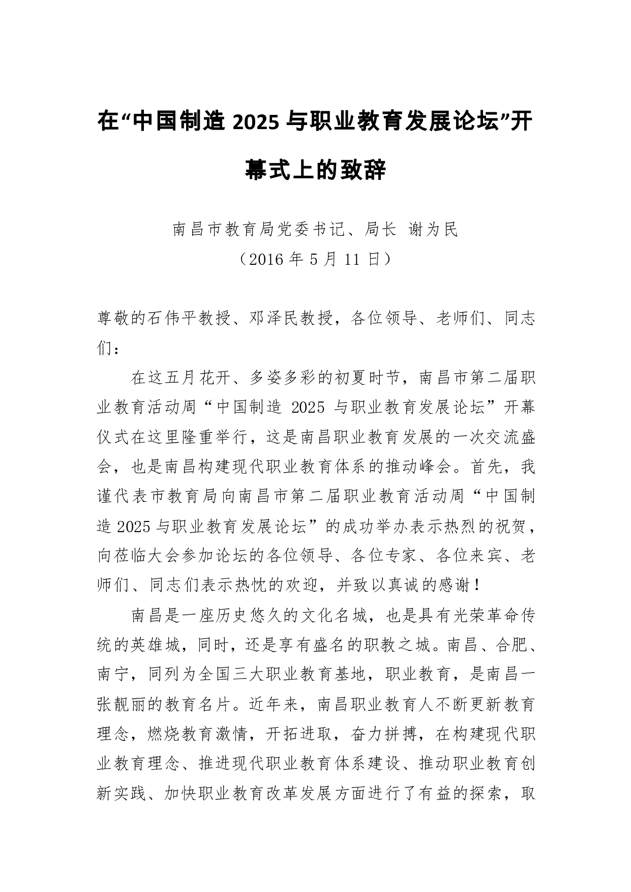 标题:谢为民:在“中国制造2025与职业教育发展论坛”开幕式上的致辞