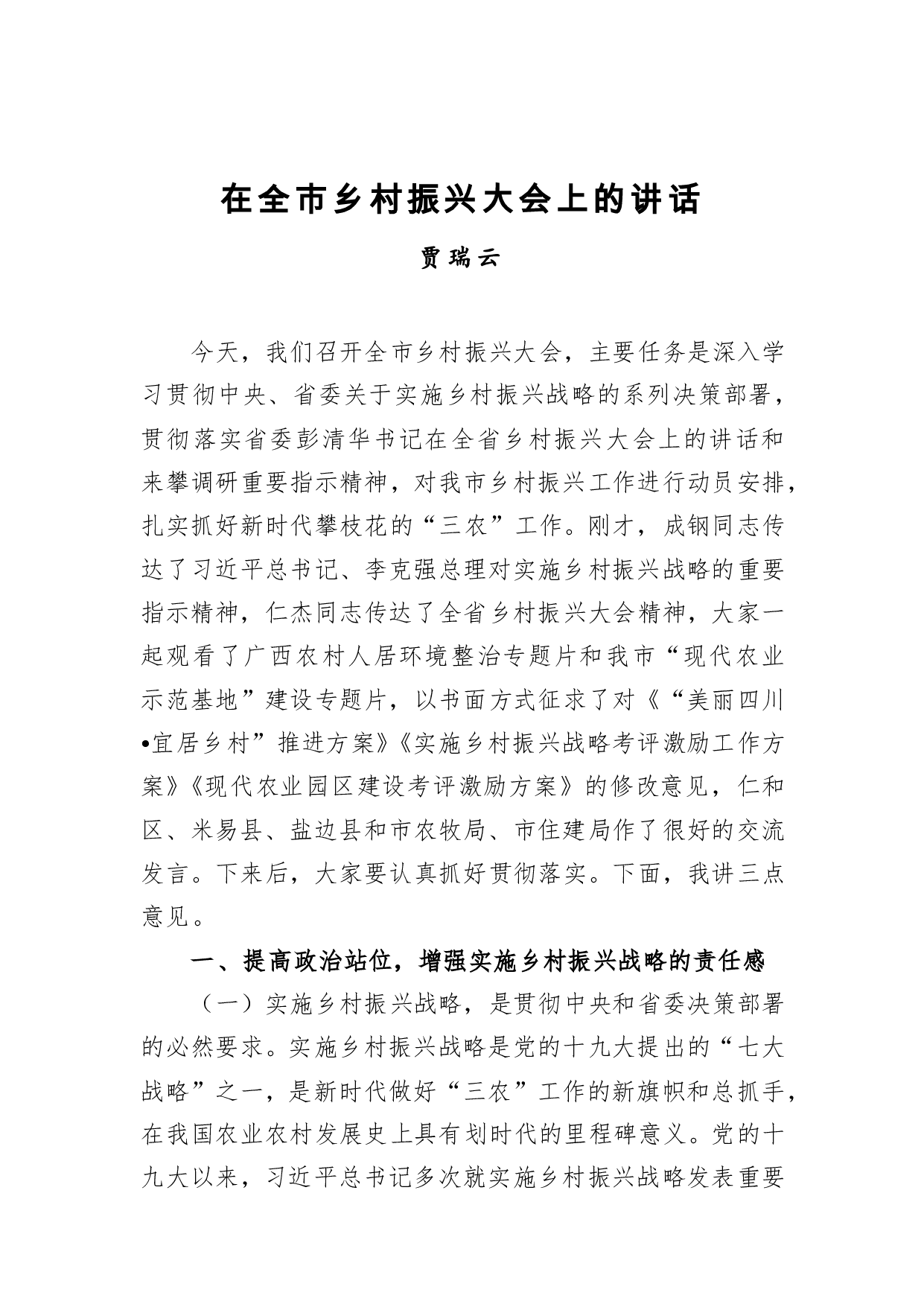 标题:贾瑞云:在全市乡村振兴大会上的讲话