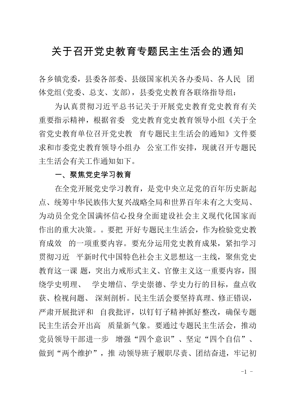 标题:关于召开党史教育专题民主生活会的通知(参考范文)