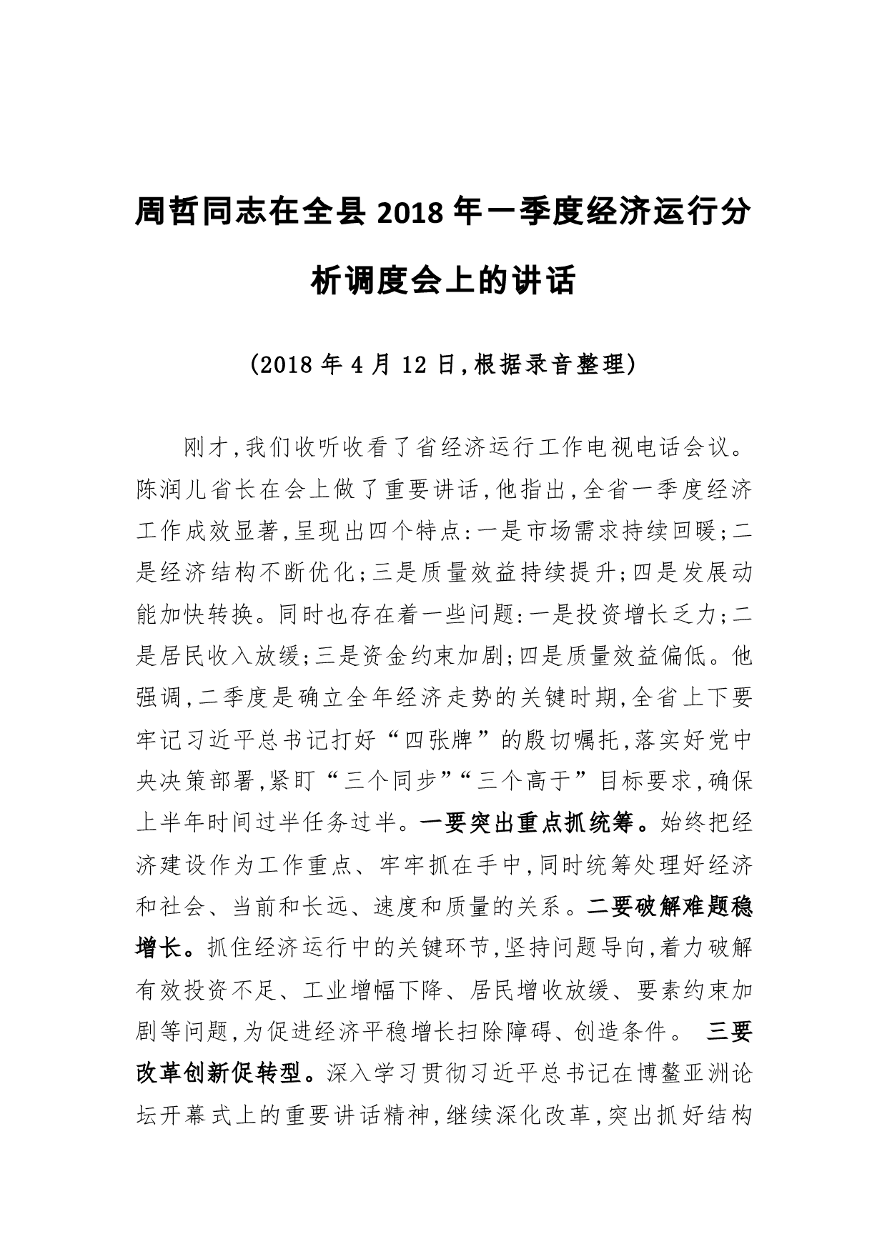标题:周哲同志:在全县2018年一季度经济运行分析调度会上的讲话
