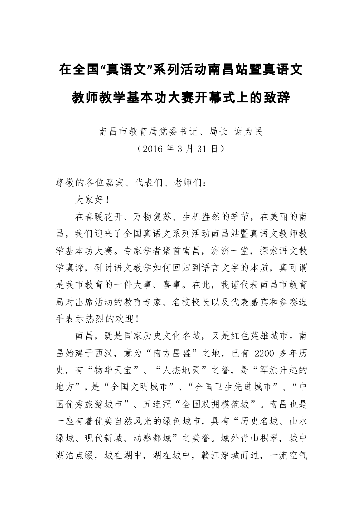 标题:谢为民:在全国“真语文”系列活动南昌站暨真语文教师教学基本功大赛开幕式上的致辞