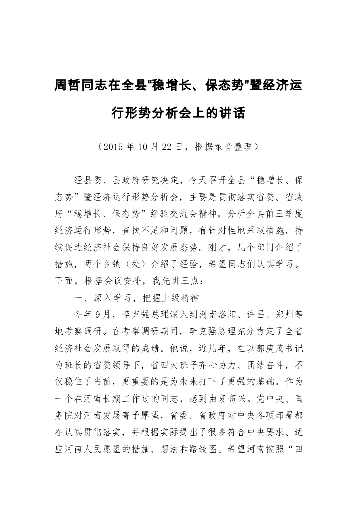 标题:周哲同志:在全县“稳增长、保态势”暨经济运行形势分析会上的讲话