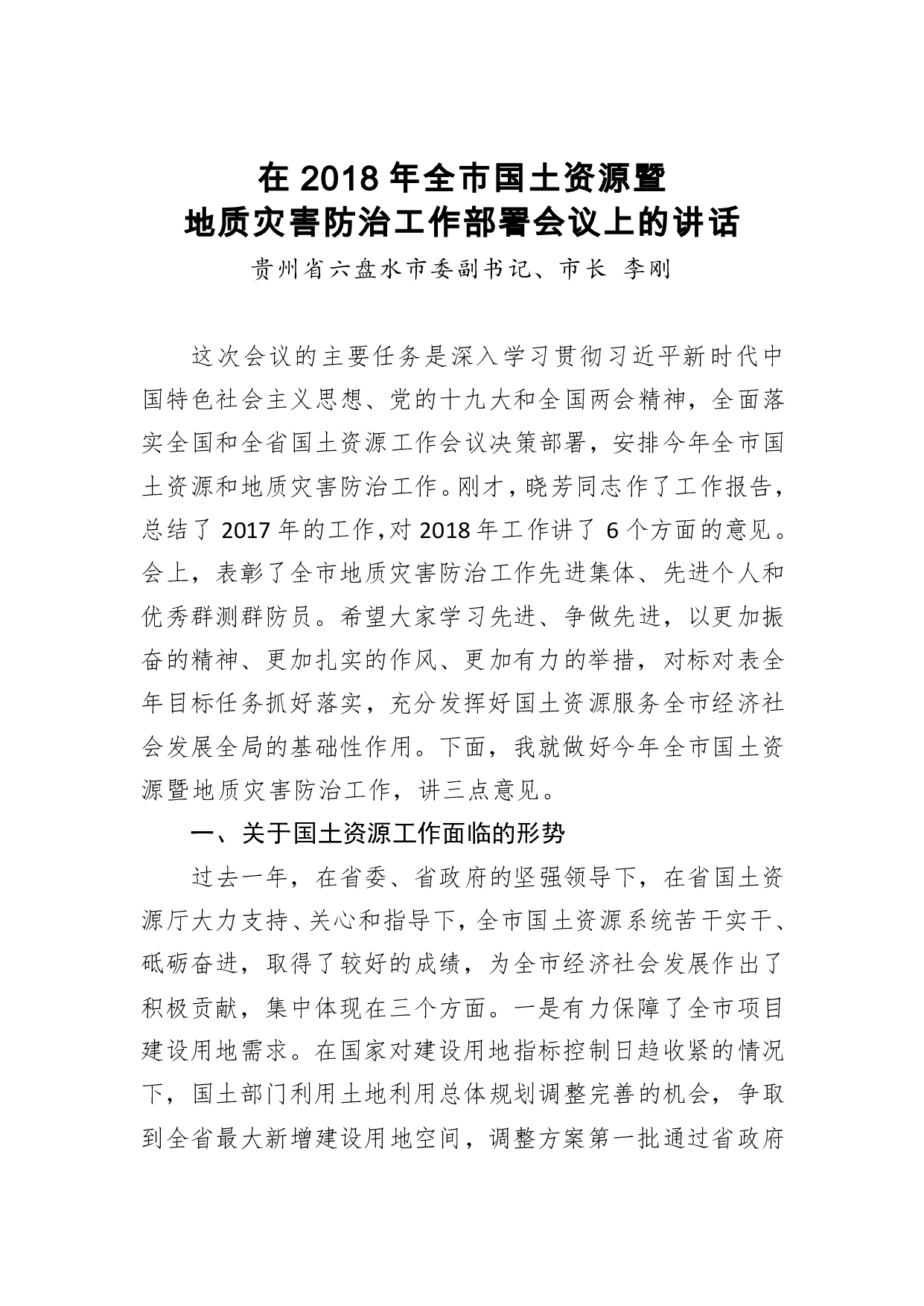 标题:2018年李刚:在2018年全市国土资源暨地质灾害防治工作部署会议上的讲话