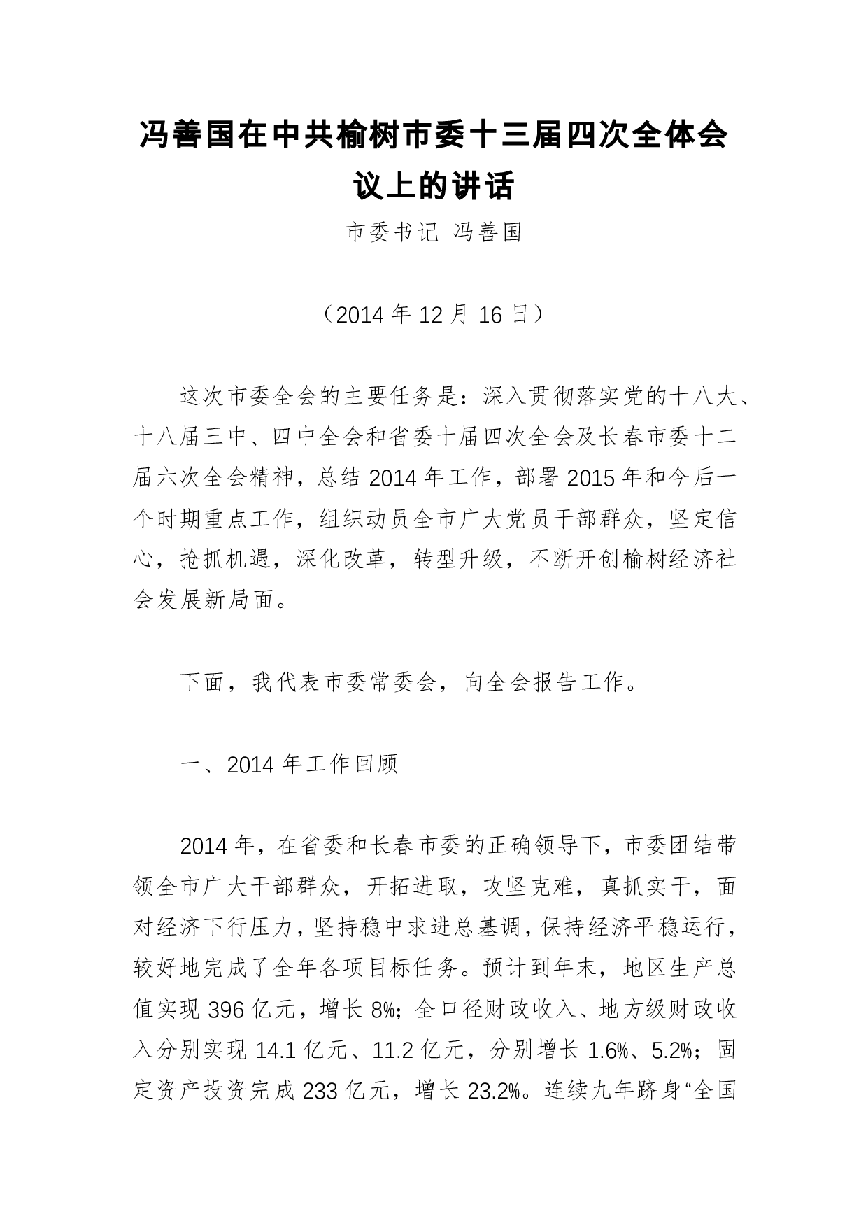 标题:冯善国:在中共榆树市委十三届四次全体会议上的讲话