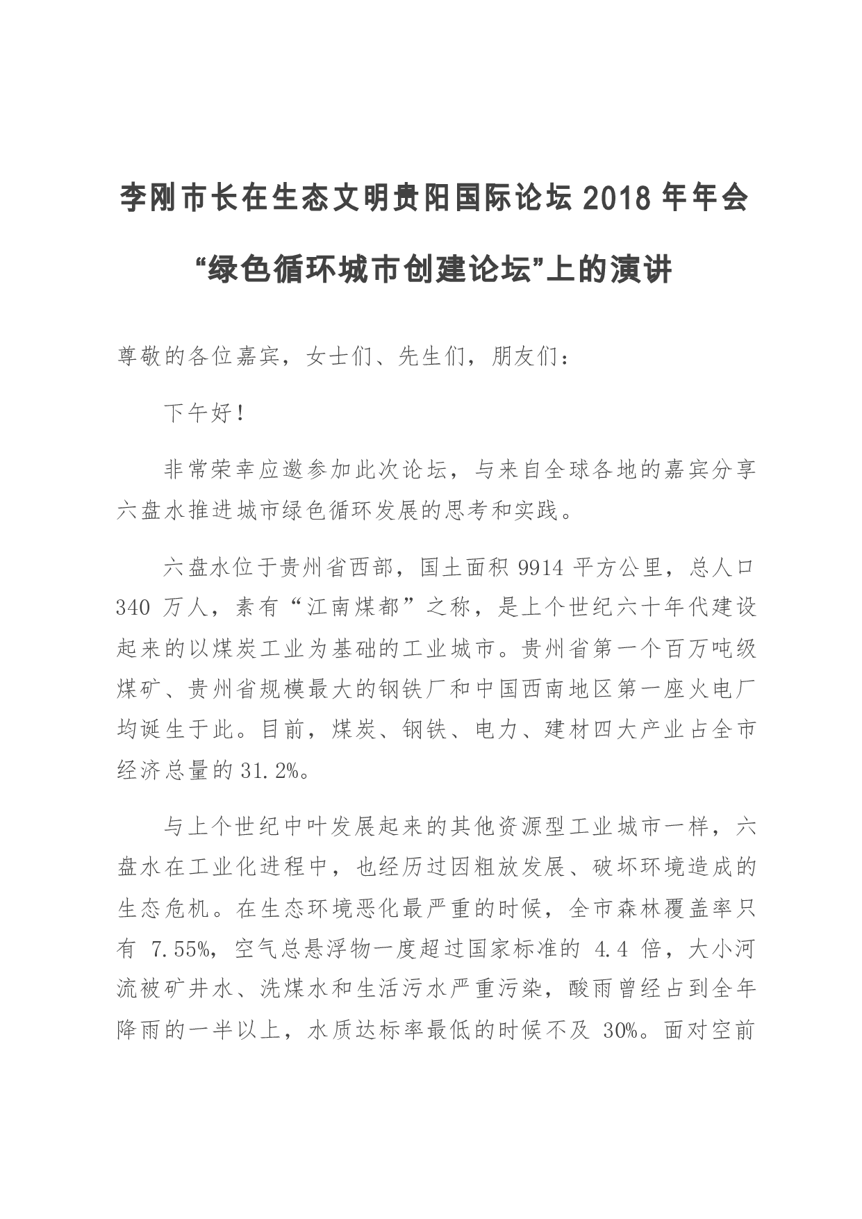 标题:李刚市长在生态文明贵阳国际论坛2018年年会上的演讲
