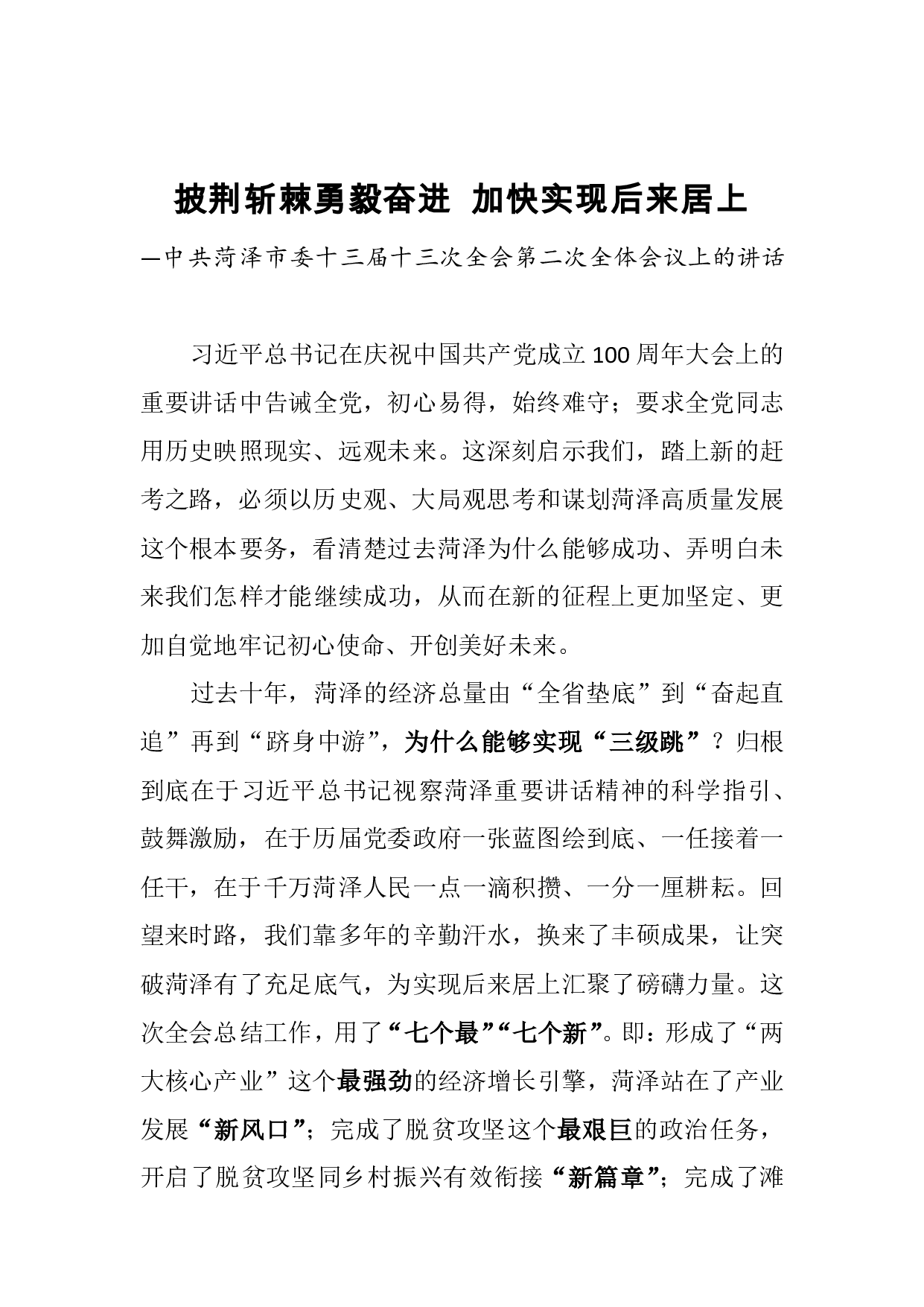 标题:中共菏泽市委十三届十三次全会第二次全体会议上的讲话