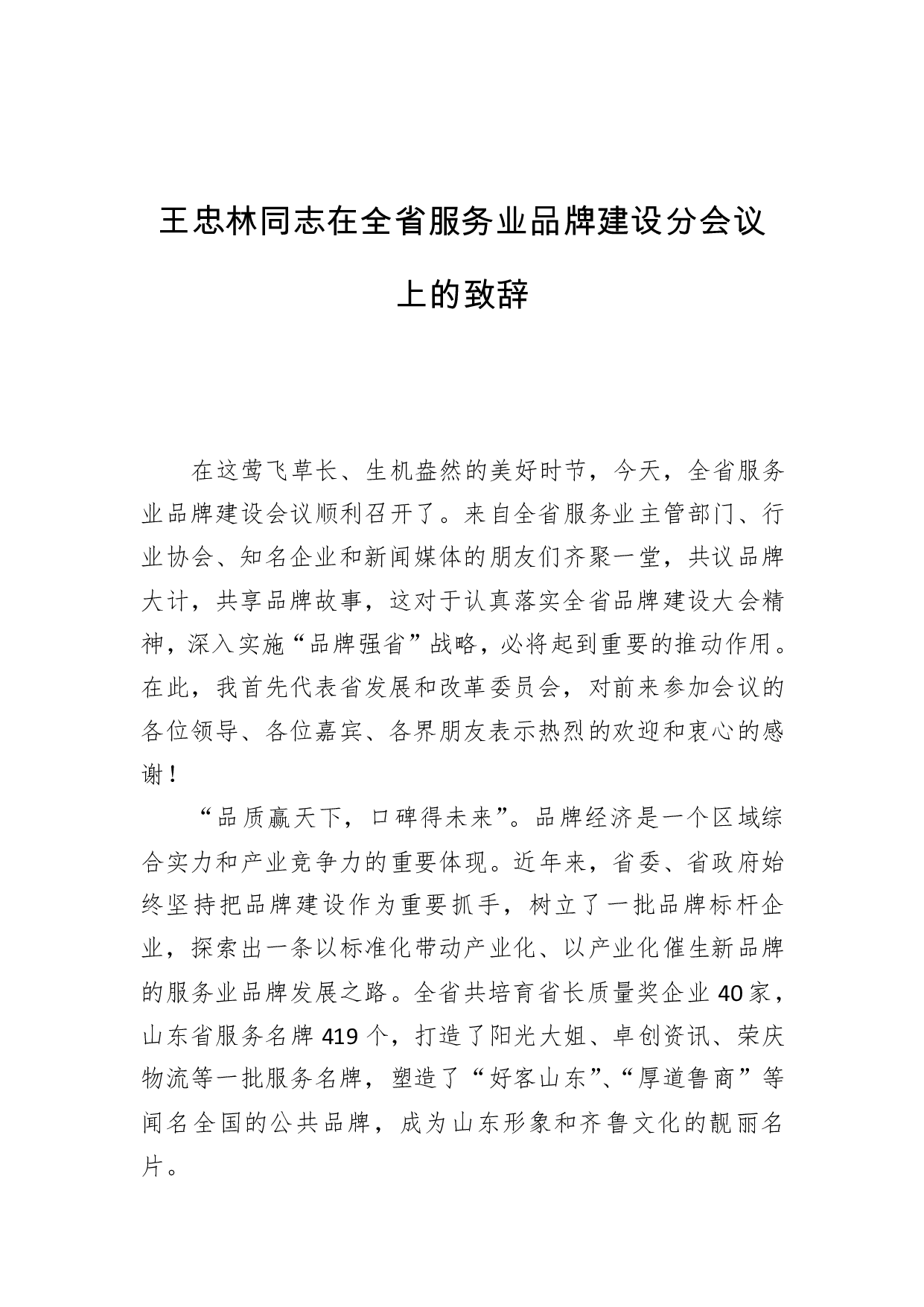标题:王忠林同志:在全省服务业品牌建设分会议上的致辞