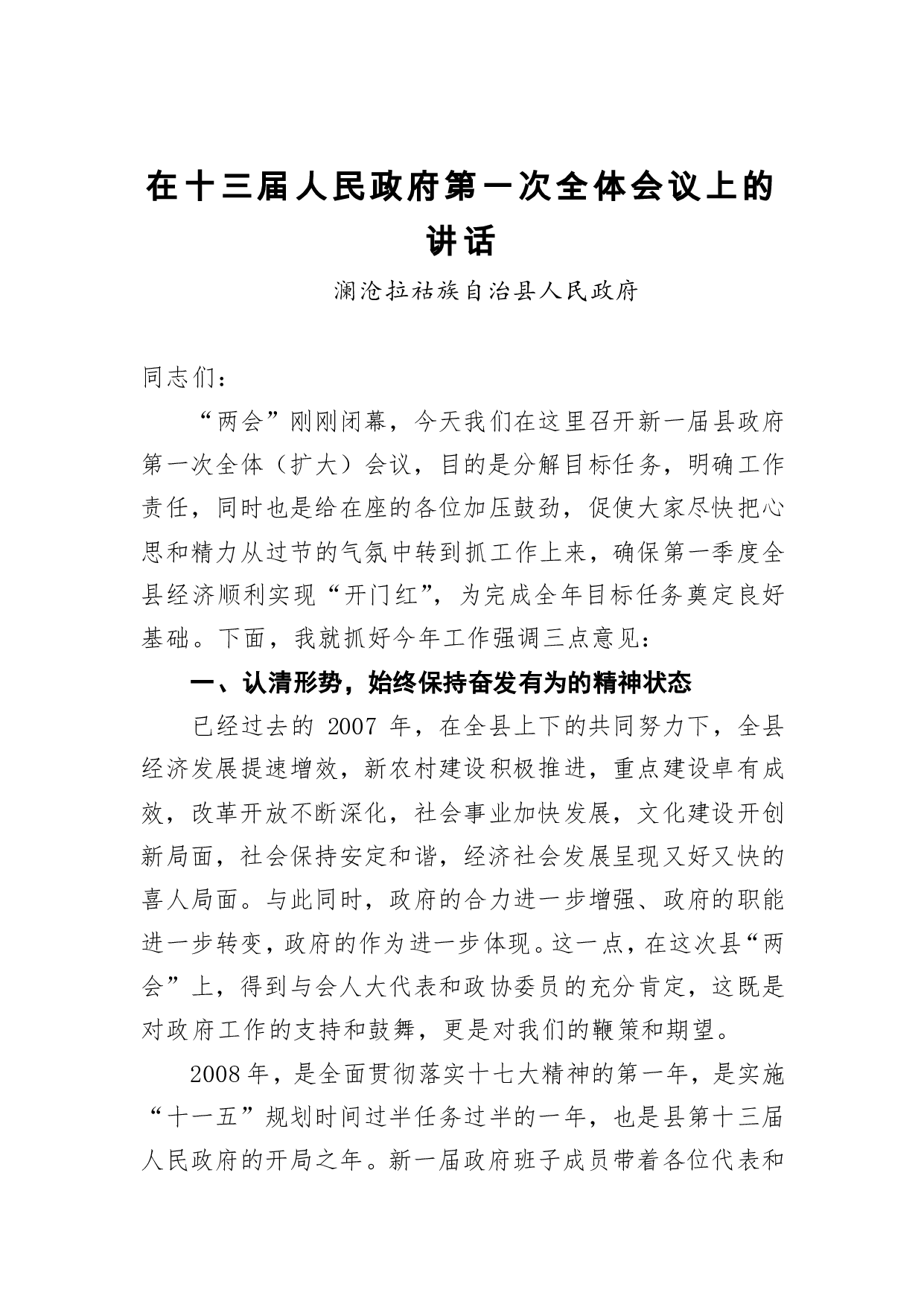标题:中共澜沧县委副书记石春云:在十三届人民政府第一次全体会议上的讲话