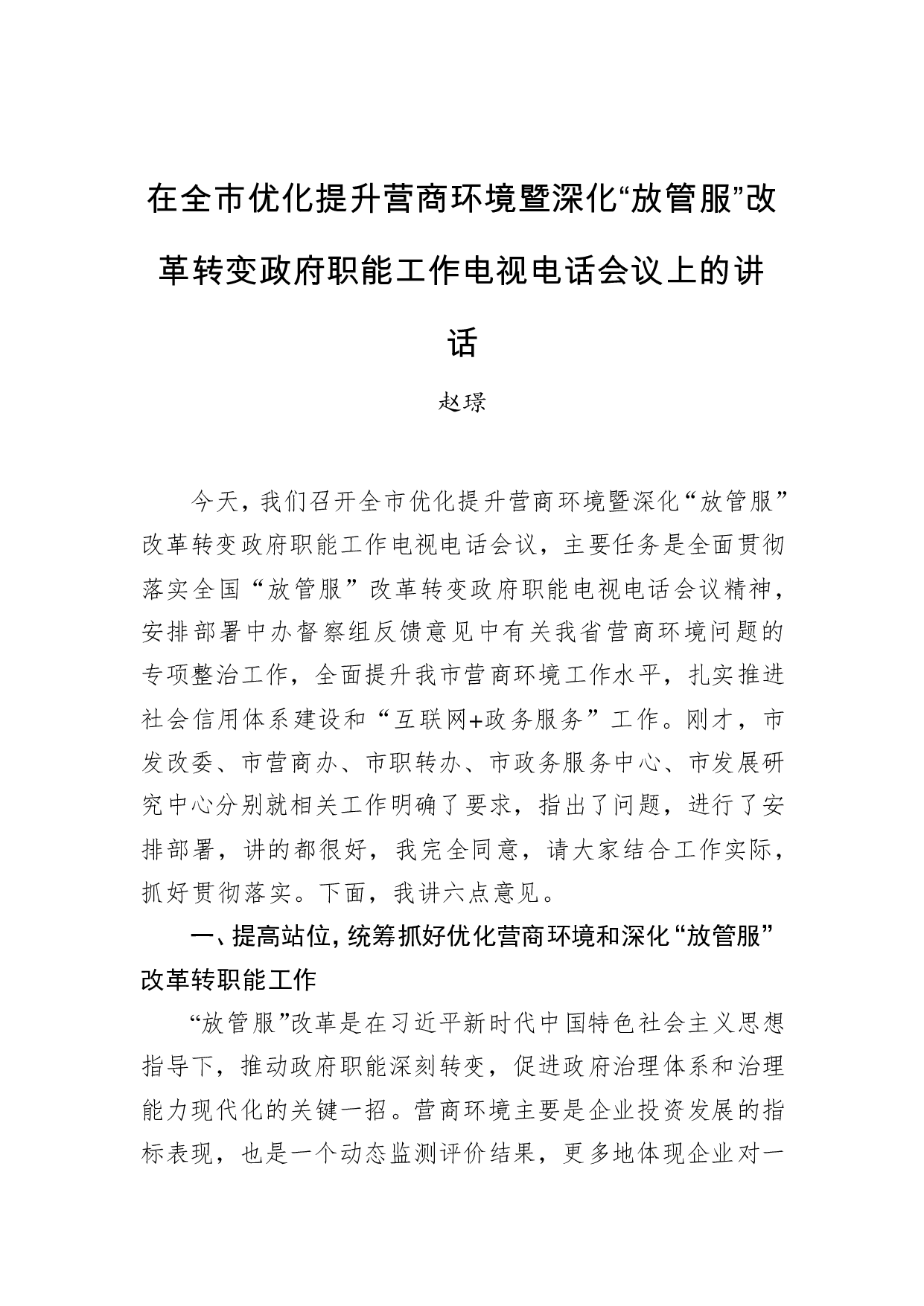 标题:赵璟:在全市优化提升营商环境暨深化“放管服”改革转变政府职能工作电视电话会议上的讲