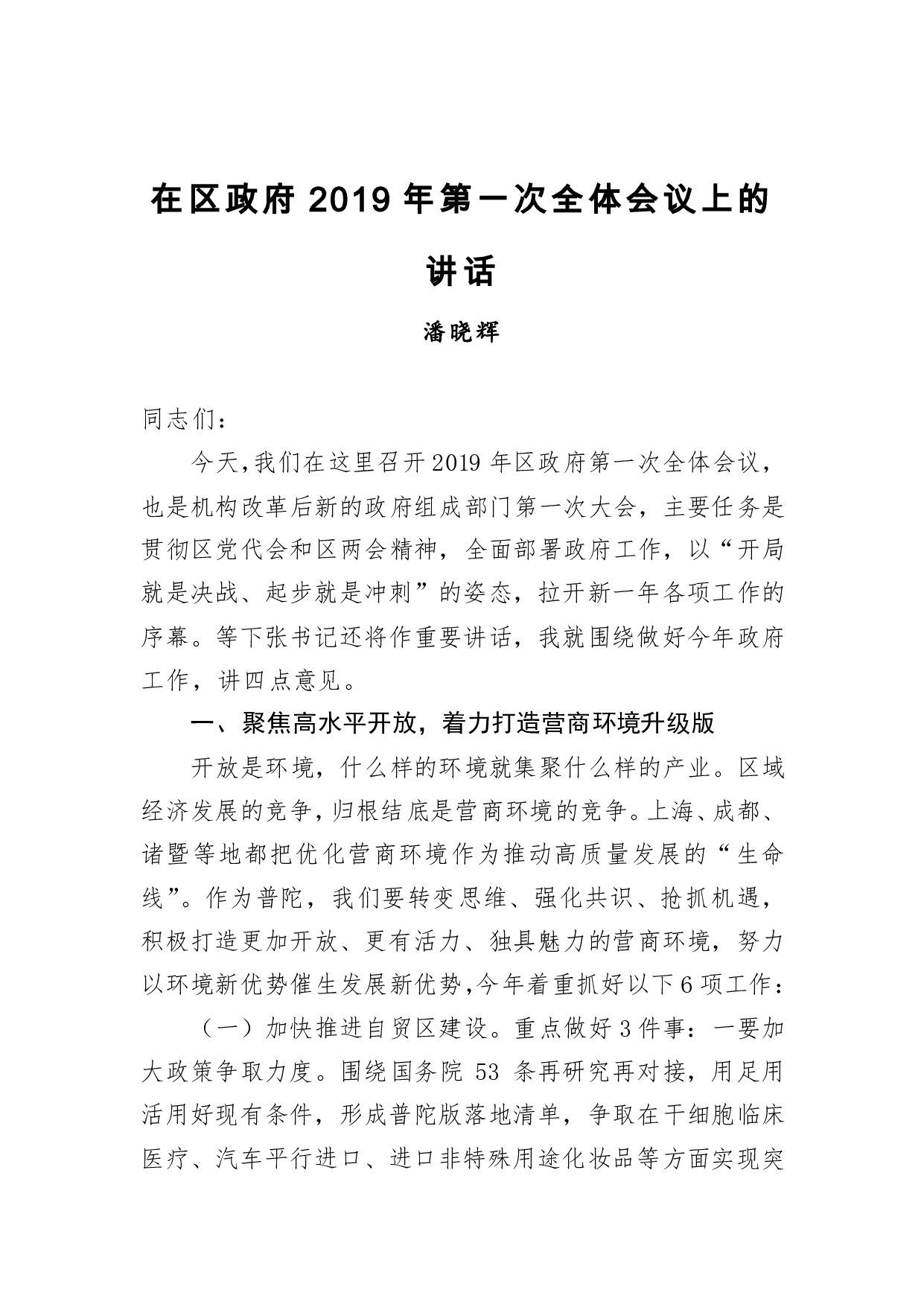标题:潘晓辉:在区政府2019年第一次全体会议上的讲话