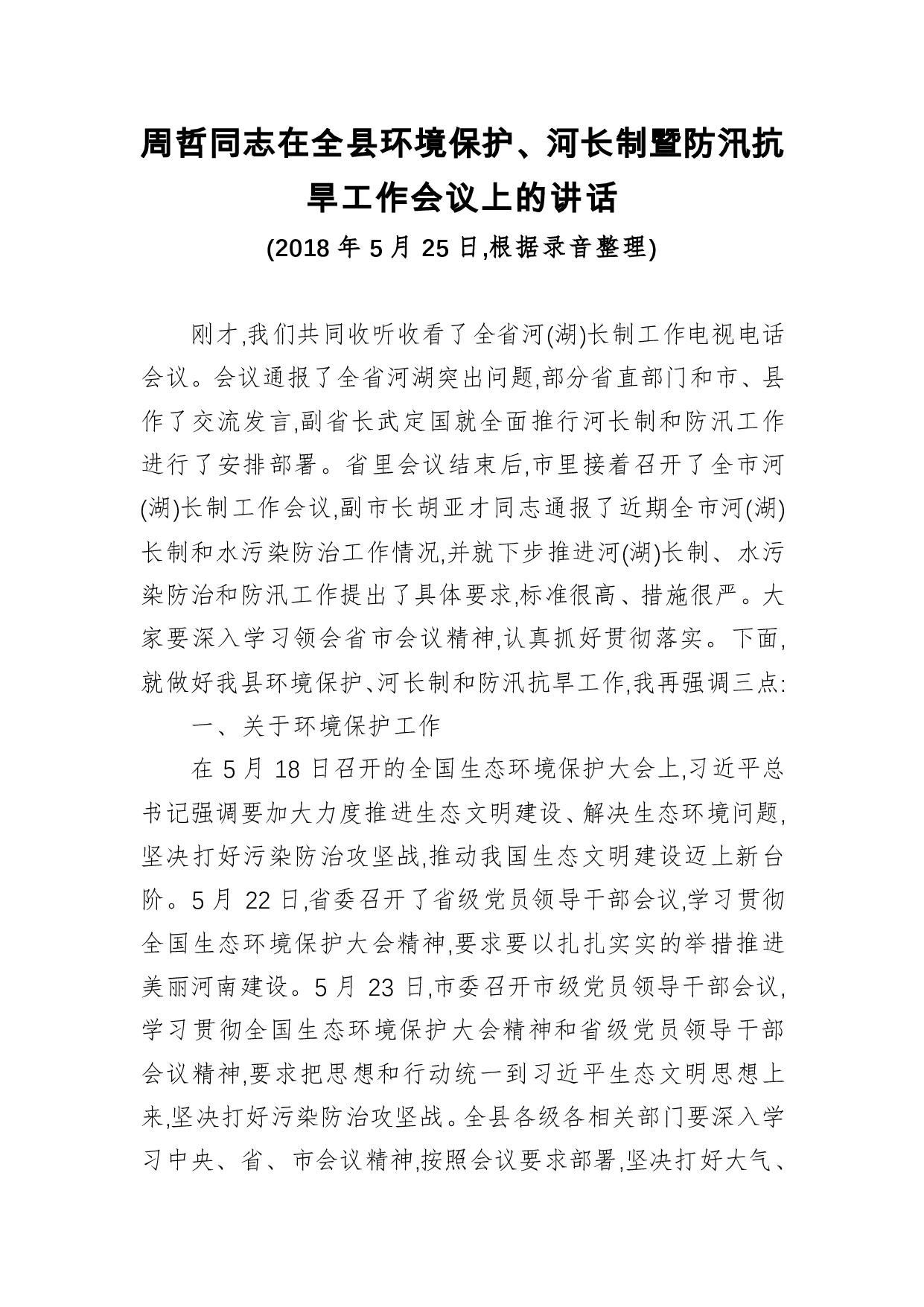 标题:周哲同志:在全县环境保护、河长制暨防汛抗旱工作会议上的讲话