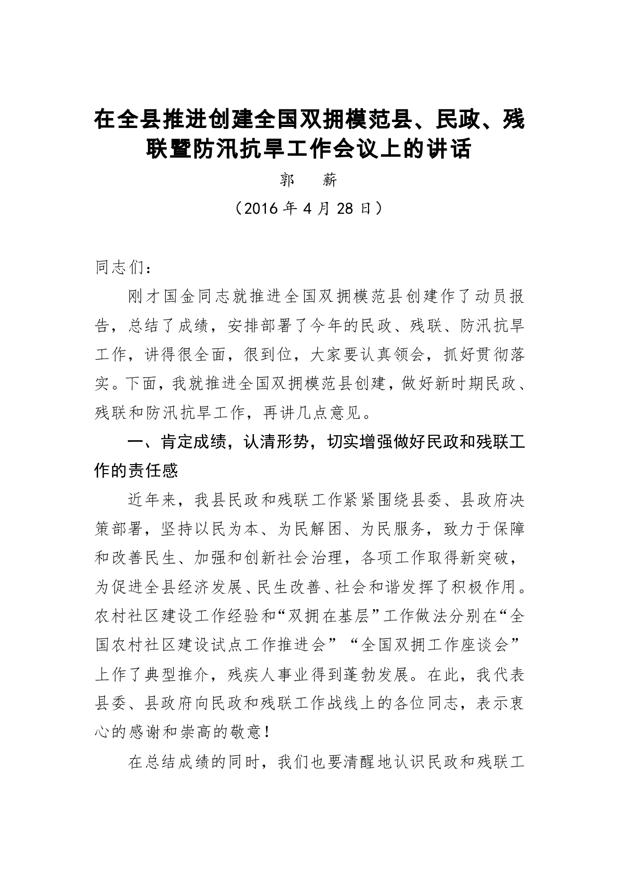 标题:郭薪:在全县推进创建全国双拥模范县、民政、残联暨防汛抗旱工作会议上的讲话