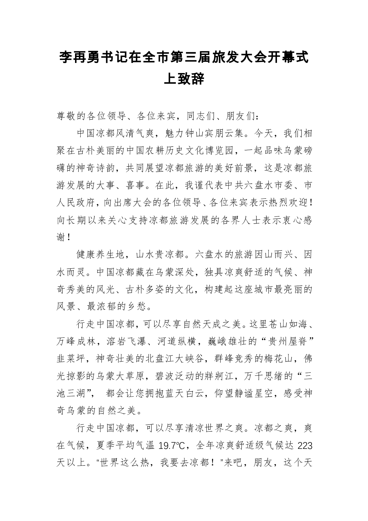 标题:李再勇书记:在全市第三届旅发大会开幕式上致辞