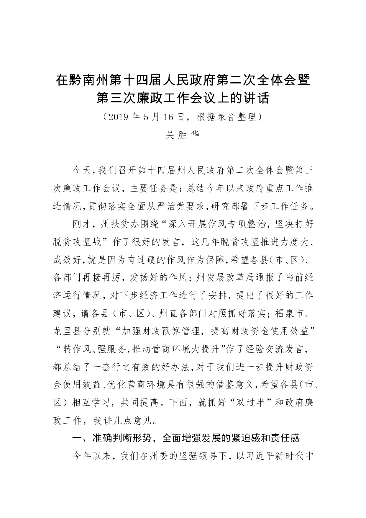 标题:在黔南州第十四届人民政府第二次全体会暨第三次廉政工作会议上的讲话