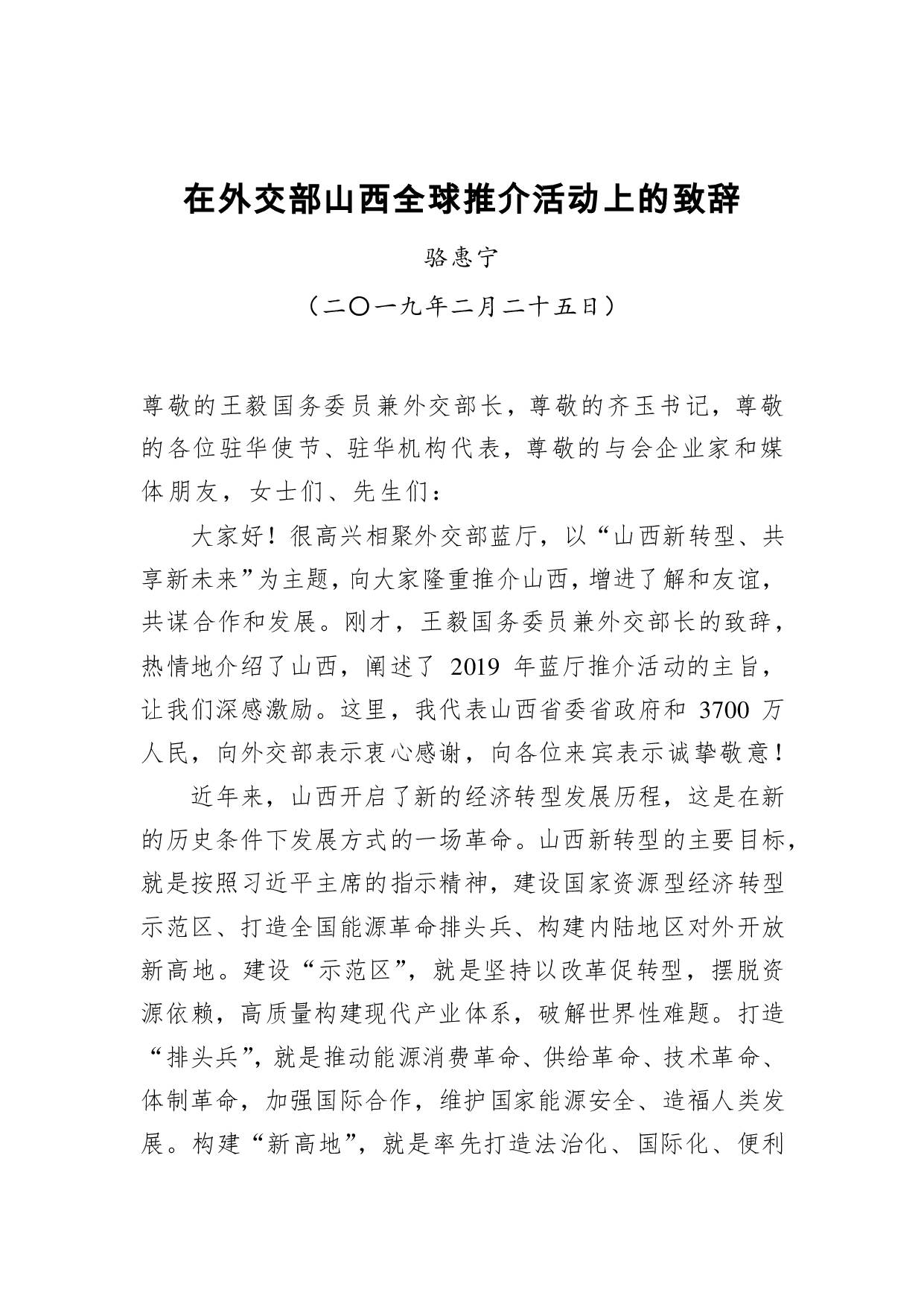 标题:骆惠宁:在外交部山西全球推介活动上的致辞