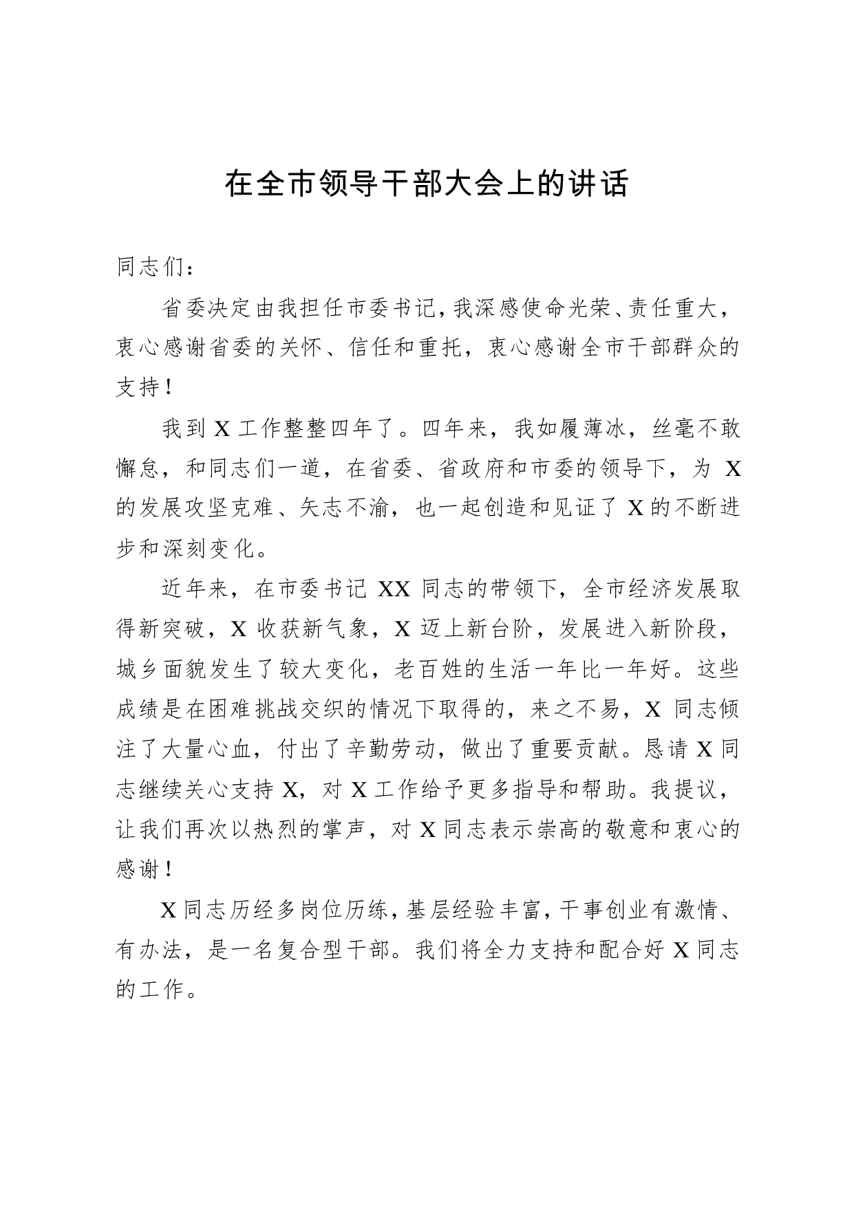 标题:市委书记在全市领导干部大会上的任职表态讲话