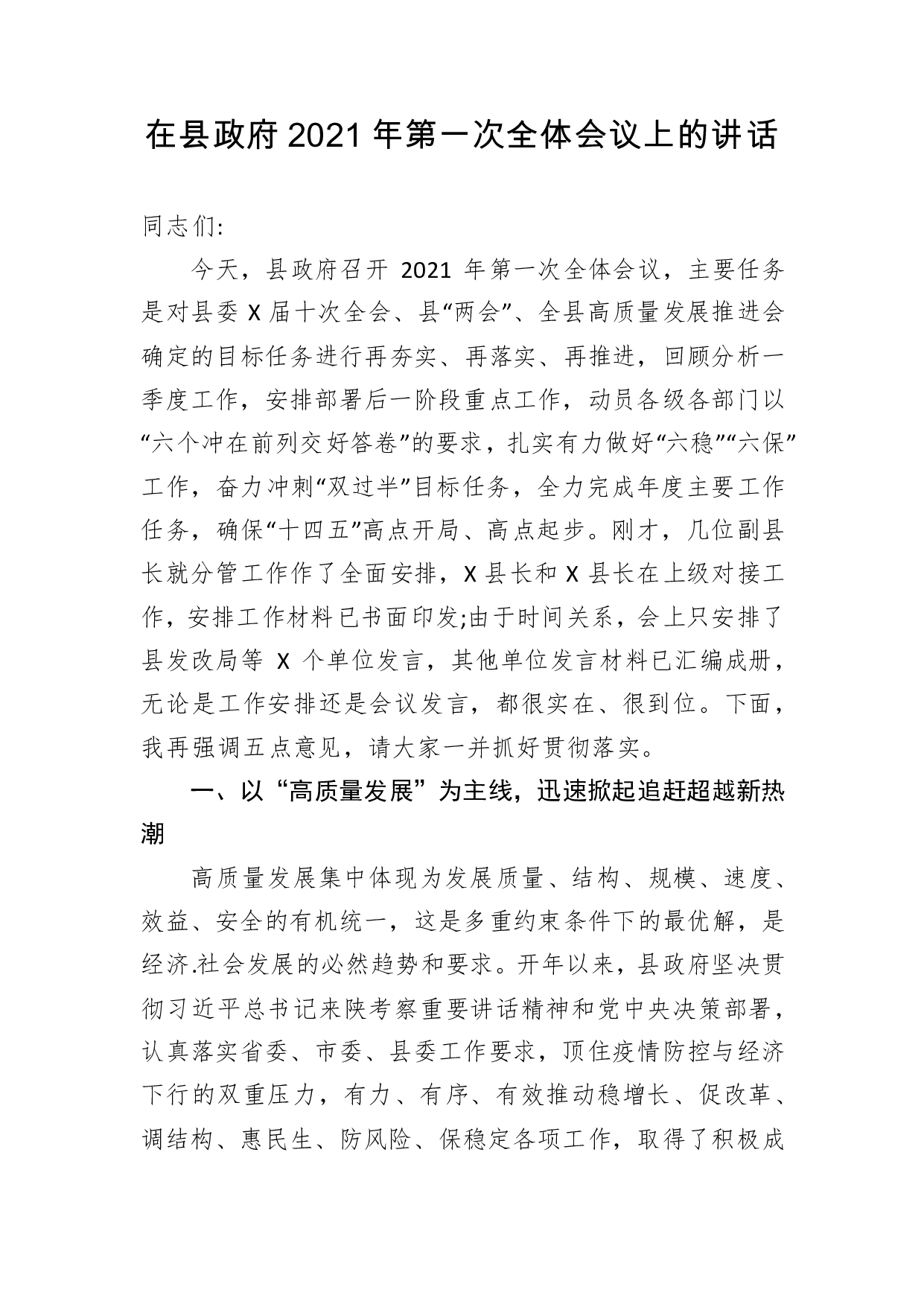 标题:在县政府2021年第一次全体会议上的讲话