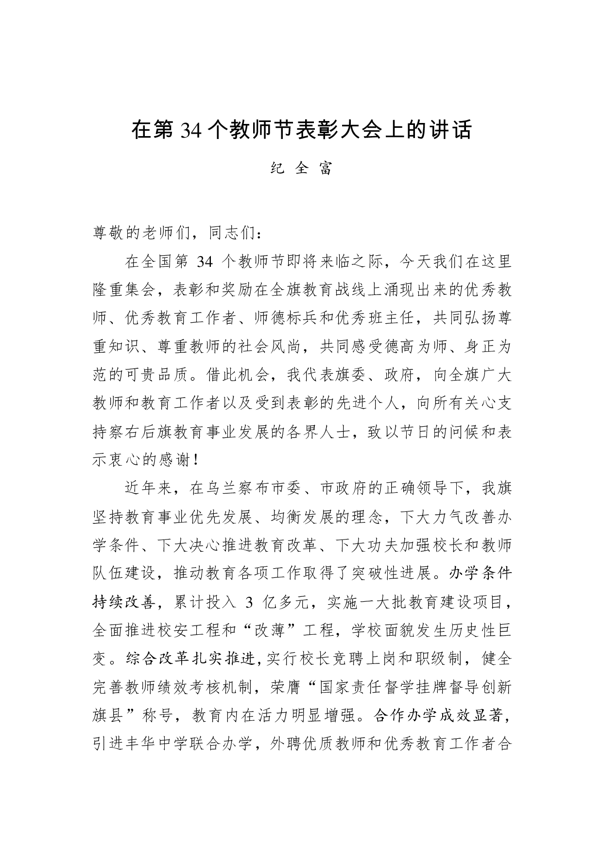 标题:纪全富:在第34个教师节表彰大会上的讲话
