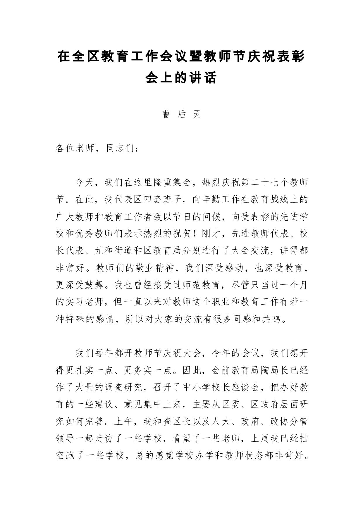 标题:教师节讲话:在全区教育工作会议暨教师节庆祝表彰会上的讲话