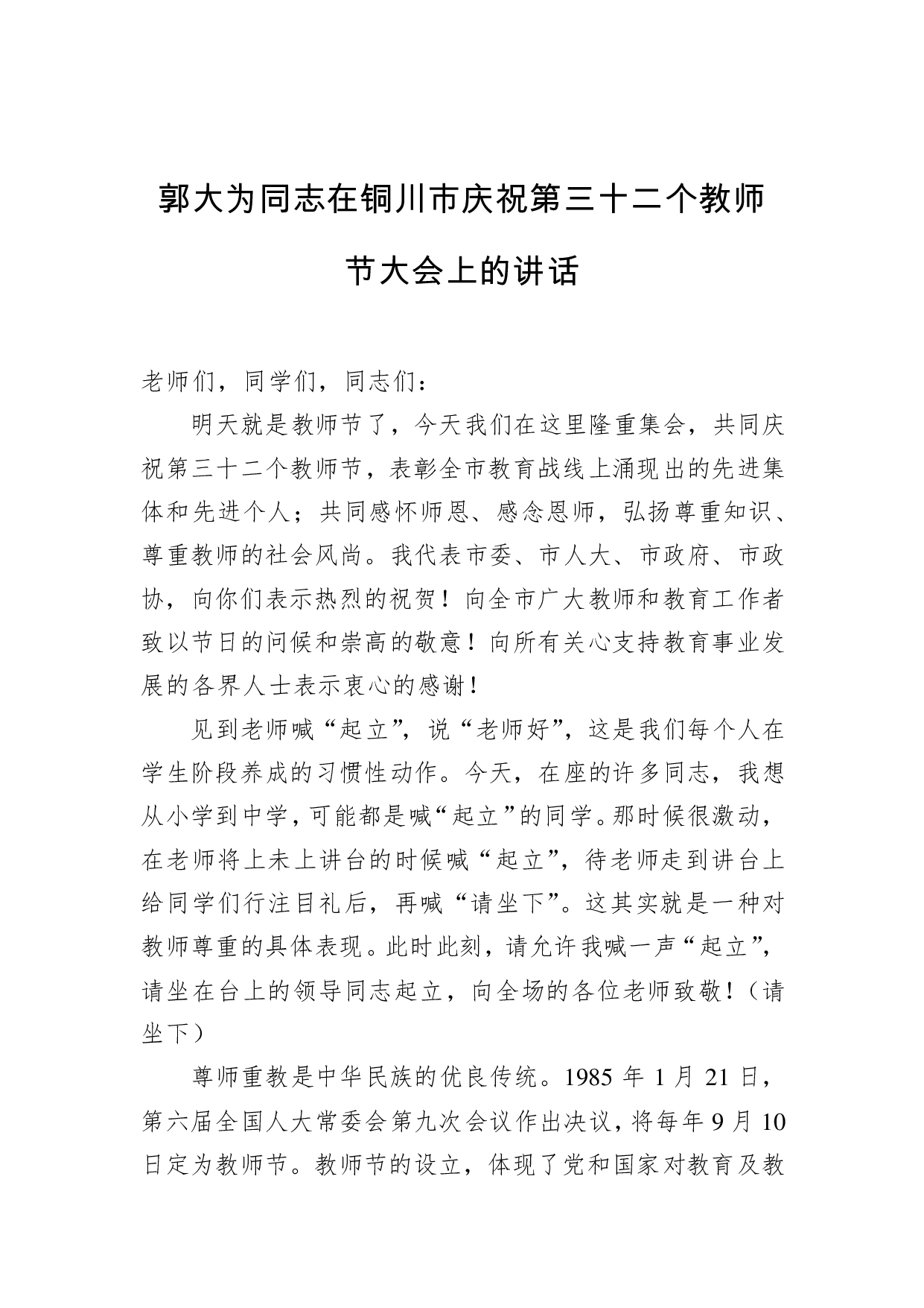 标题:郭大为:在铜川市庆祝第三十二个教师节大会上的讲话