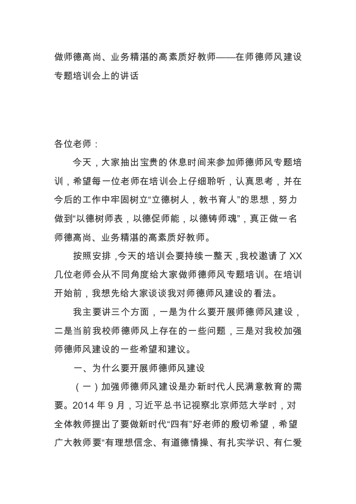 标题:做师德高尚、业务精湛的高素质好教师——在师德师风建设专题培训会上的讲话